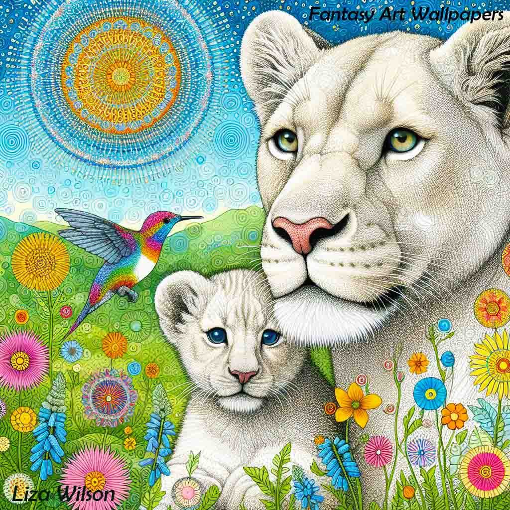 White lioness & cub on hills with wild flowers and humming birds, Spirograph style.