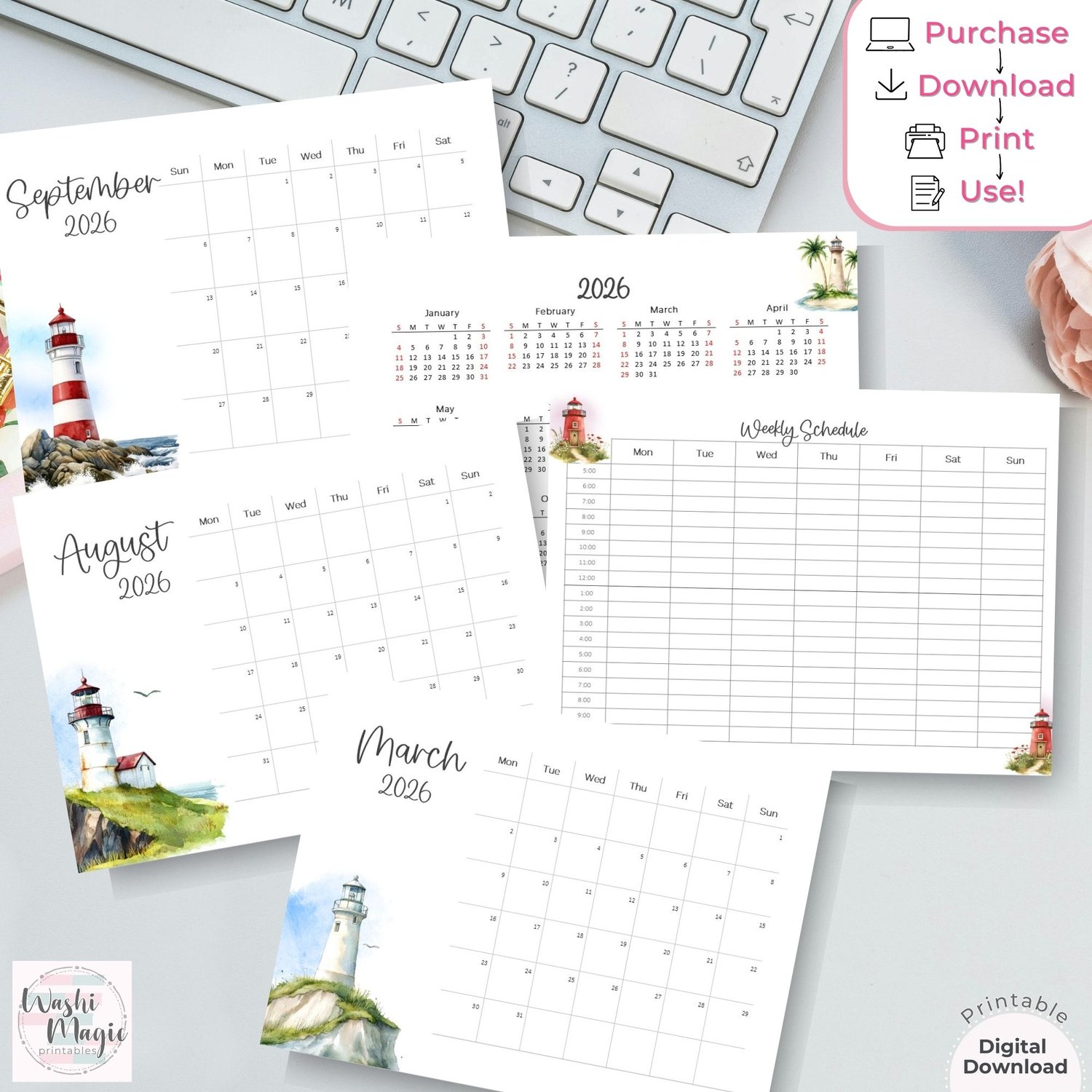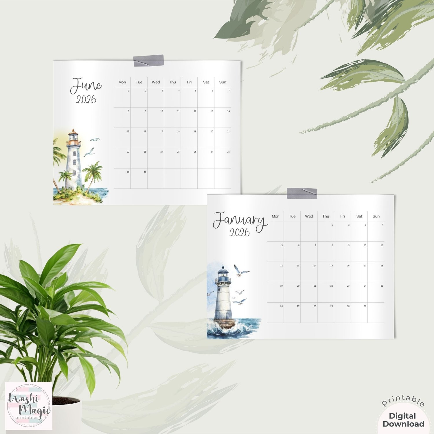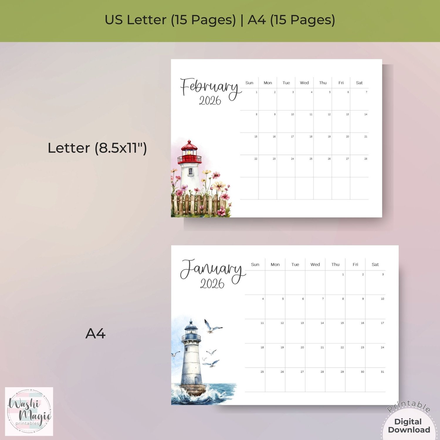 2026 Lighthouse Dated Calendar: Monthly Landscape Year at a Glance Printable (PDF)
