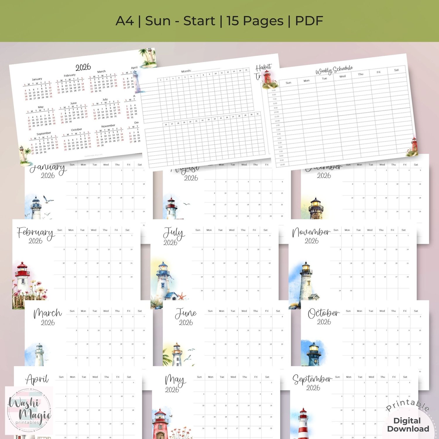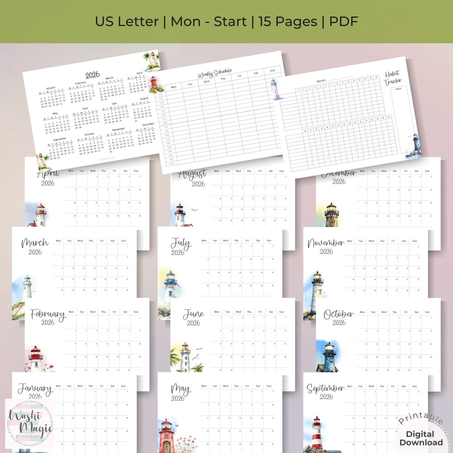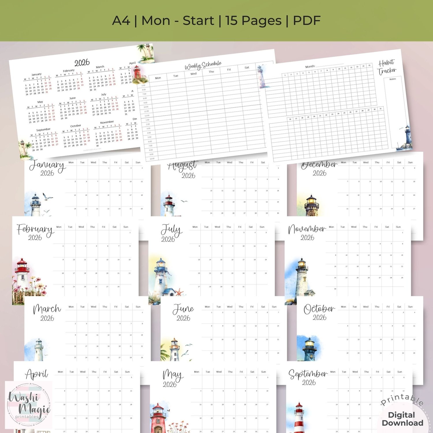 Stay organized and inspired with our 2026 dated calendar printable featuring a beautiful lighthouse design. This landscape horizontal calendar is perfect for planning, tracking, and organizing your schedule, along with a convenient habit tracker.