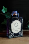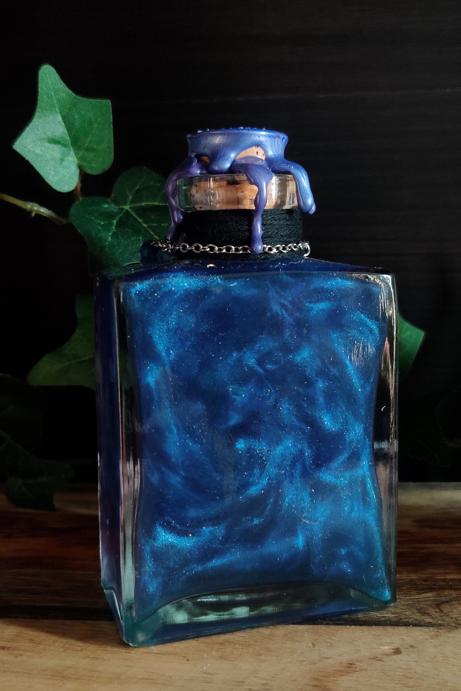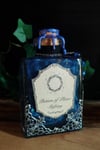 Pullossa on violettia nestettä ja se on koristeltu käsintehdyllä etiketillä, narulla ja hopeisella ketjulla sekä helmillä ja riipuksella. Pinnassa myös hopeiset filigraanikoristeet.