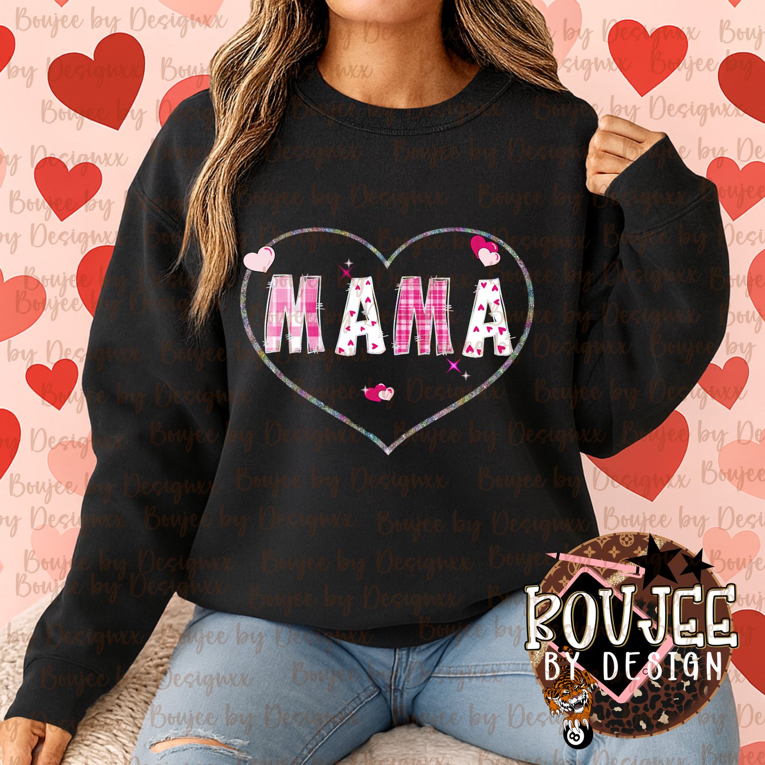 This Valentine MAMA design features a sparkly heart outline with pink patchwork letters and sweet heart details. Simple, cute, and perfect for creating trendy Valentine shirts, sweatshirts, and gifts for moms.