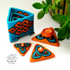 Teulu Tri, meaning Family Three. A beautiful trio of triangular lidded boxes, each with a different knotwork design on the sides. Make all three, and store them inside one another, or display them on their own, or make just one. Experiment with colour to create your own unique set.