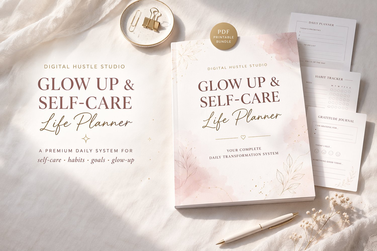 Transform your daily life with the Glow Up & Self-Care Life Planner by Digital Hustle Studio — a premium, structured self-improvement system designed to help you upgrade your mindset, habits, and lifestyle step by step.