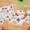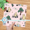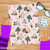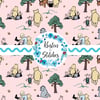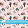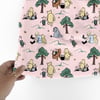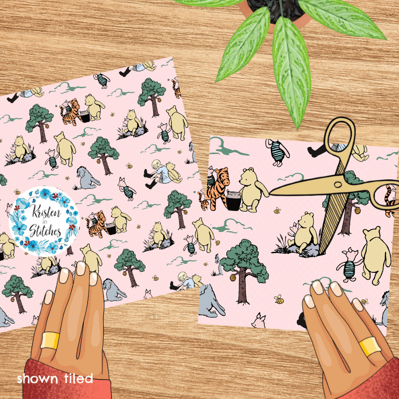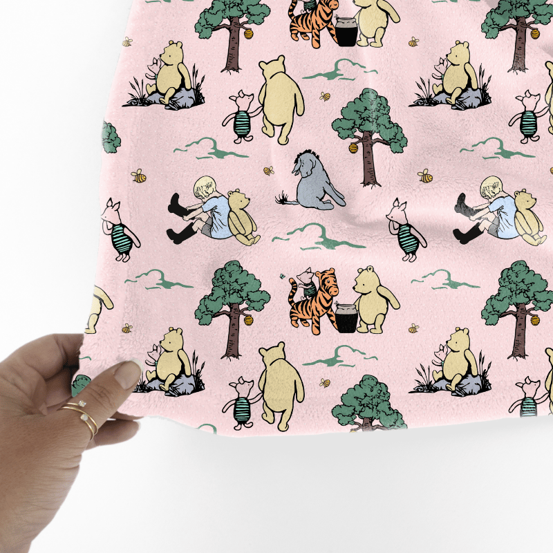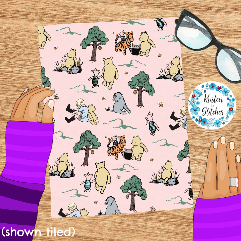 Classic Pooh storybook sketches from the 100 Acre Wood, including Eeyore, Tigger and Piglet on soft pink.