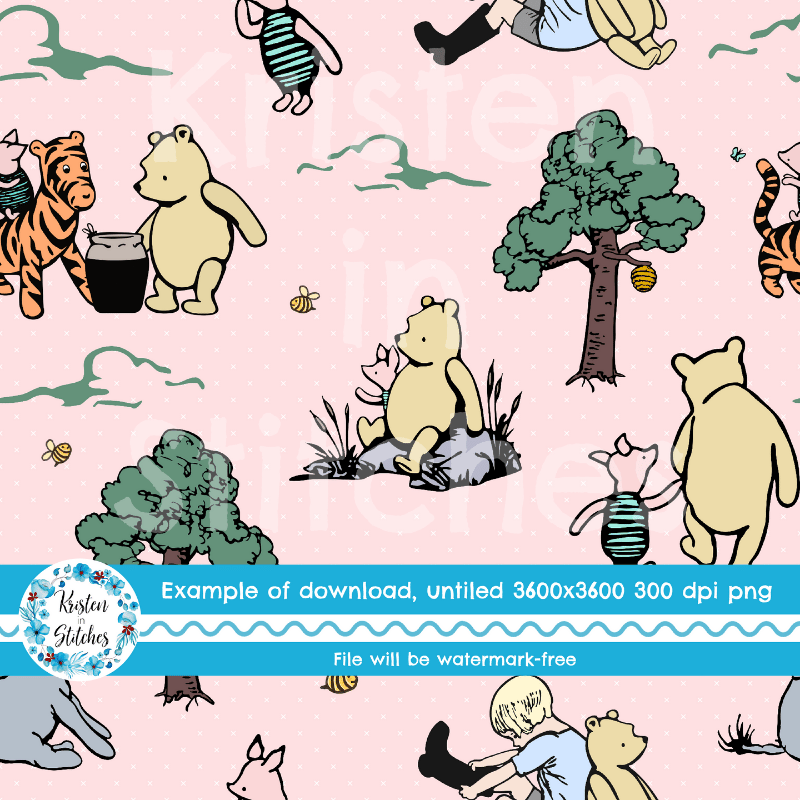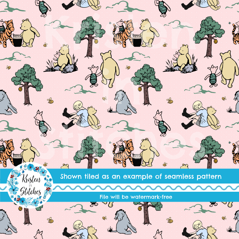 Classic Winnie the Pooh and Friends Storybook Sketches Nursery Seamless Pattern Soft Pink