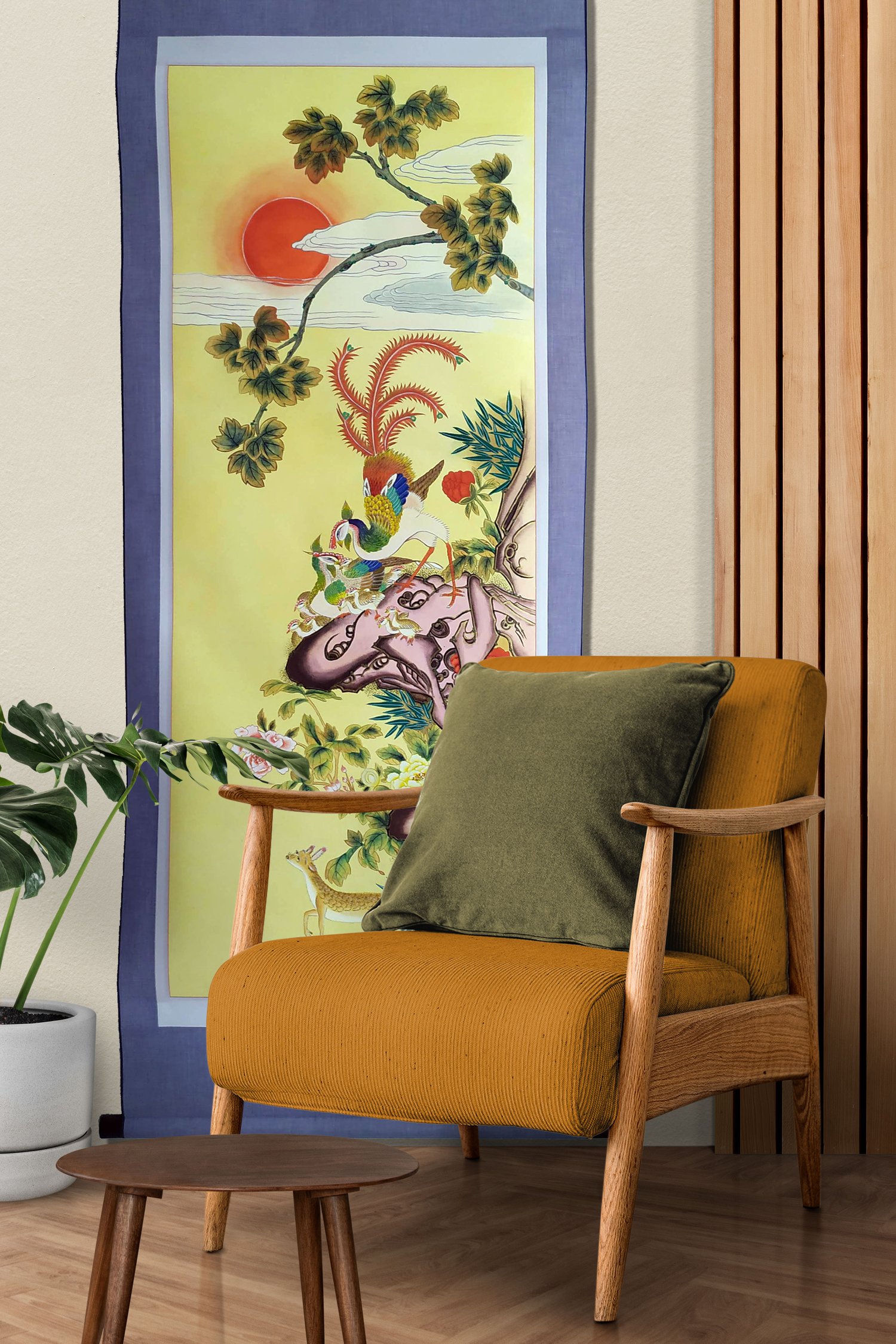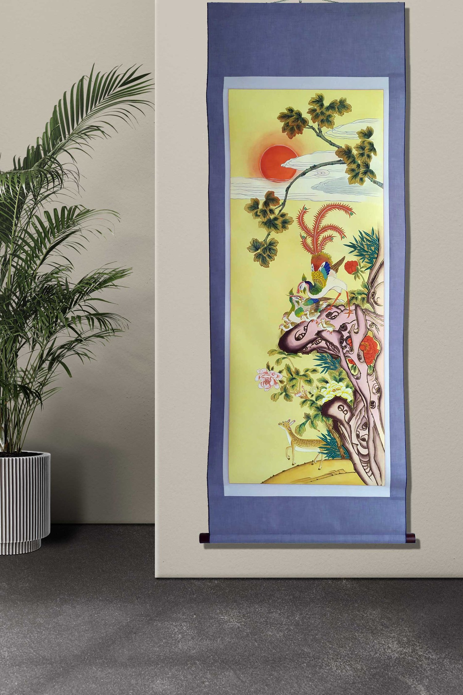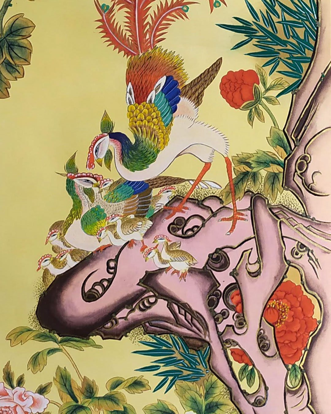 It depicts a male phoenix trying to protect its babies as a musk deer passes by.