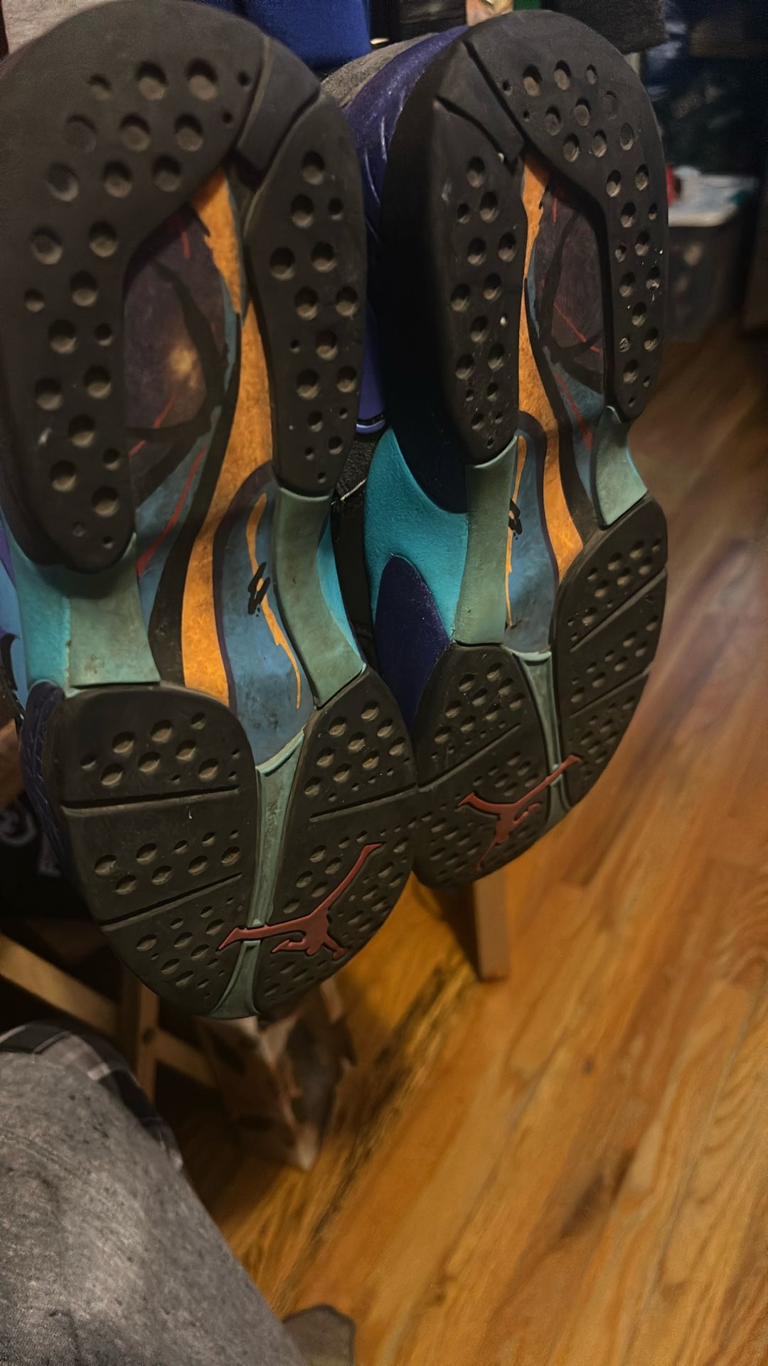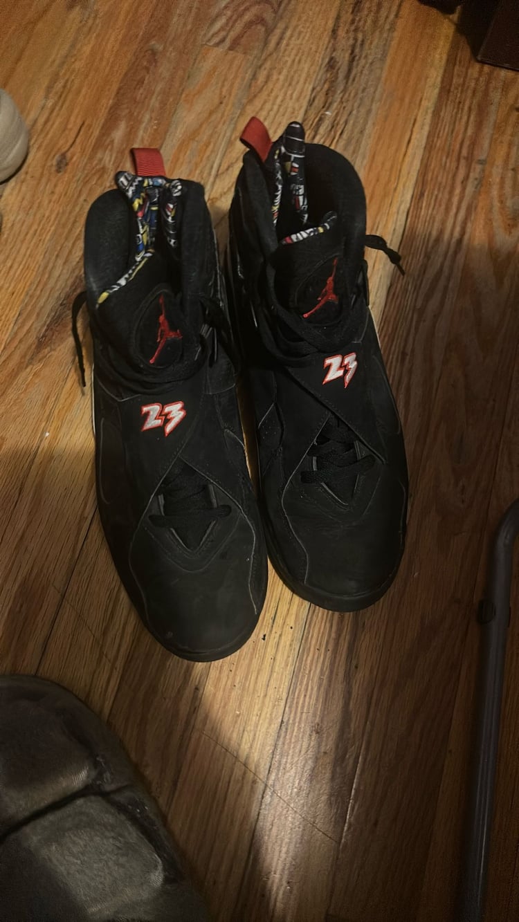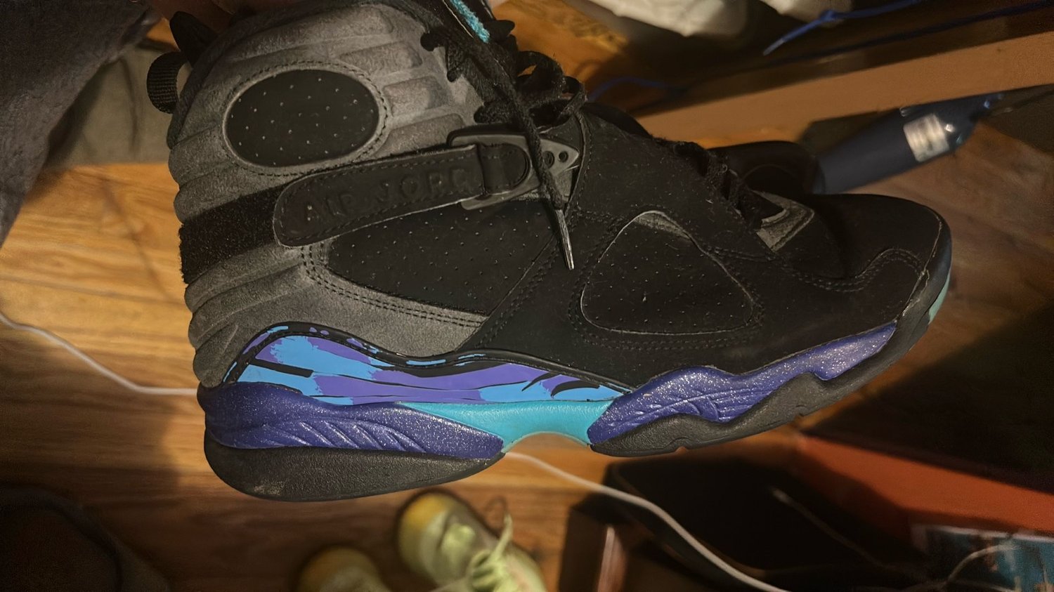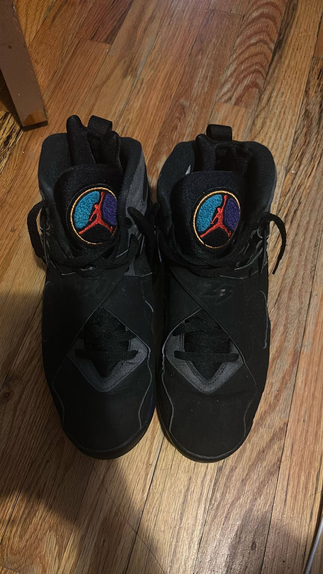 Jordan 8 Retro “Aqua” (2015) – Size 10 Step into sneaker history with the Air Jordan 8 Retro “Aqua” (2015) — a re-release of one of the most iconic and colorful Air Jordan silhouettes ever designed. Originally debuted in 1993 as one of the three OG Jordan 8 colorways and famously worn by Michael Jordan during the NBA All-Star Game, the Aqua has become a fan-favorite for collectors and style-minded enthusiasts alike.  This 2015 retro stays true to its roots with a premium black durabuck/nubuck upper that delivers a luxe look and feel, accented with Bright Concord purple and Aquatone teal pops along the midsole, heel, and signature chenille tongue patch — giving the sneaker its distinctive “Aqua” personality.  The design features Air Jordan 8’s classic midfoot crossover straps, a functional aesthetic element that adds lockdown support and timing-attack ’90s flair. Underfoot, the cushioned midsole with encapsulated Air units ensures responsive comfort, while the solid rubber outsole with multi-directional traction gives you grip whether you’re on the court or out on the streets.  Why This Pair Matters • Heritage Classic: Celebrates one of the original Air Jordan 8 colorways from 1993.  • Bold Colorway: Black base with purple and teal accents that pop.  • Signature AJ8 Design: Midfoot straps, chenille tongue logo, and rugged construction.  • Versatile Wear: Ideal for collectors or daily wear with a retro-era vibe.  Perfect for fans of Jordan Brand history or anyone looking to add a timeless and colorful retro to their rotation.