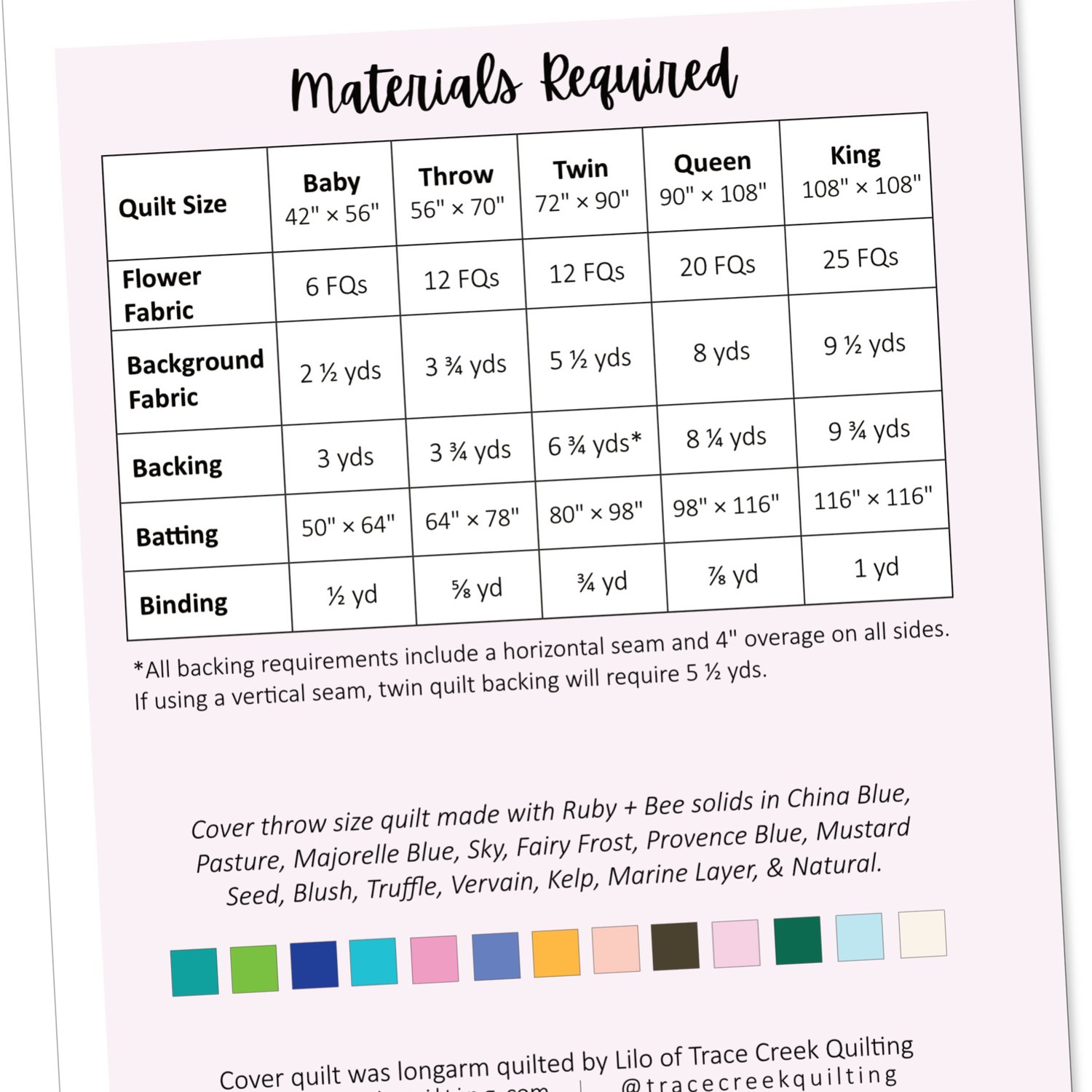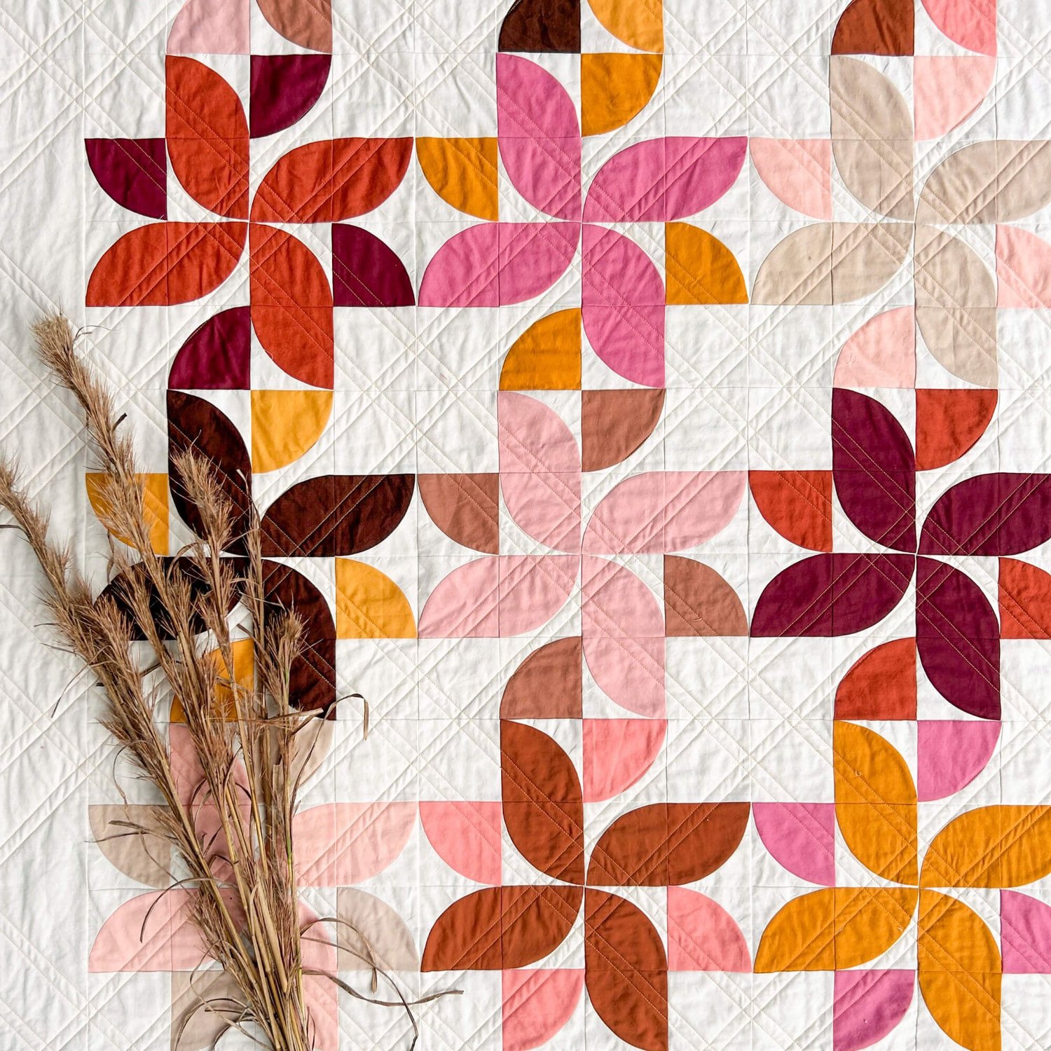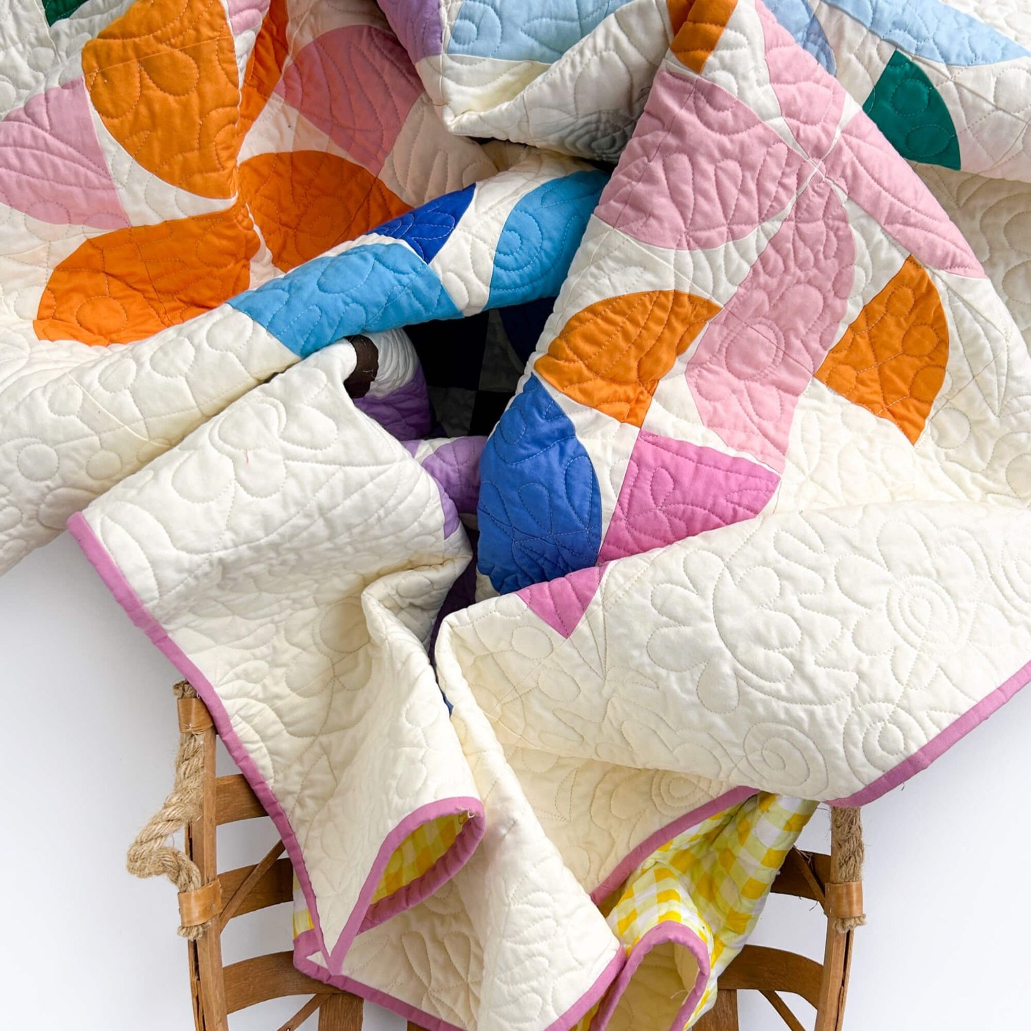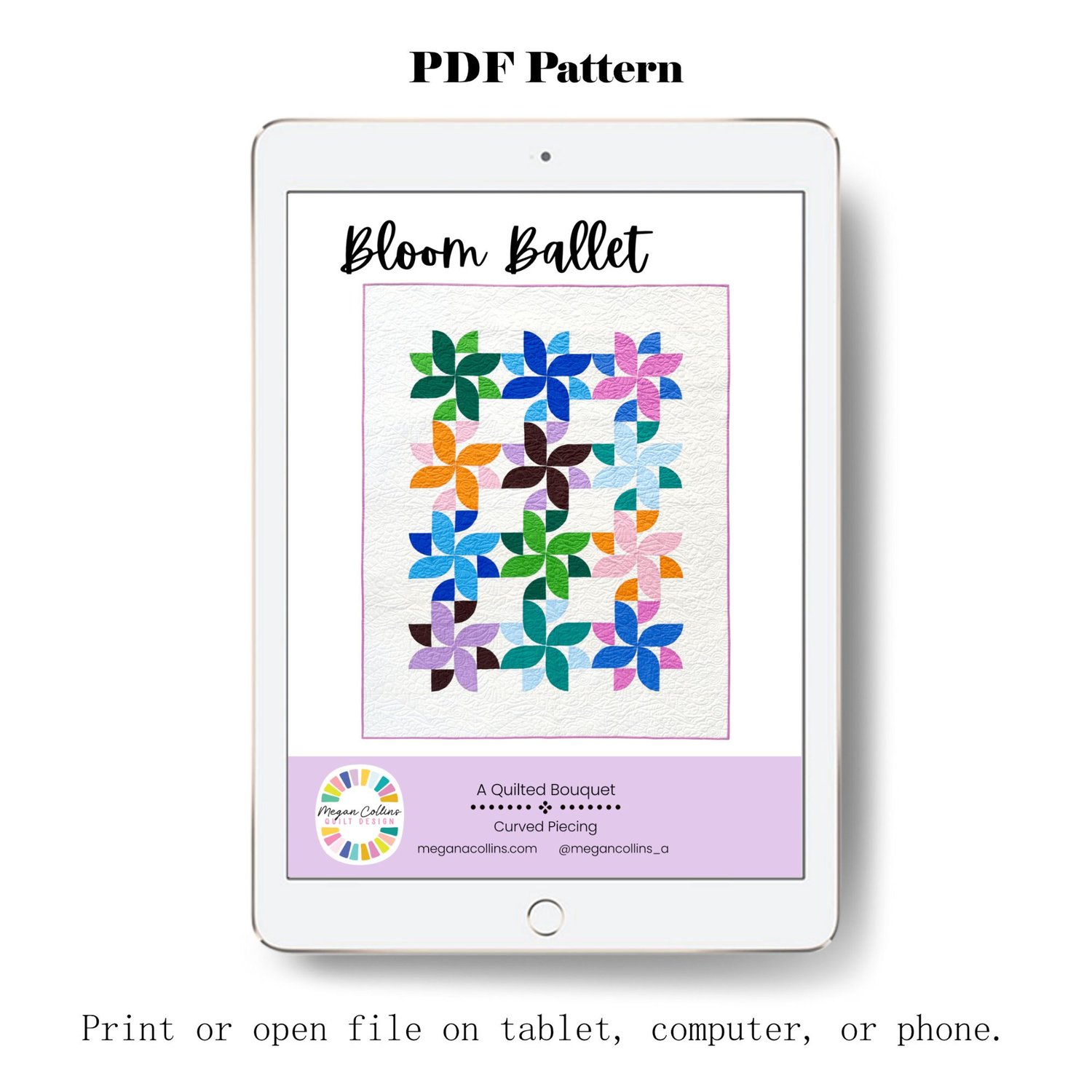Bloom Ballet is a fat quarter–friendly quilt pattern featuring flowers that spin and dance across the quilt top. Each bloom feels light and playful, with curved petals that invite you to mix, match, and experiment—whether that means coordinating solids, playful prints, or a little of both. A wide border of negative space lets the flowers shine and gives the finished quilt a modern, airy feel—perfect for showing off your fabric choices.