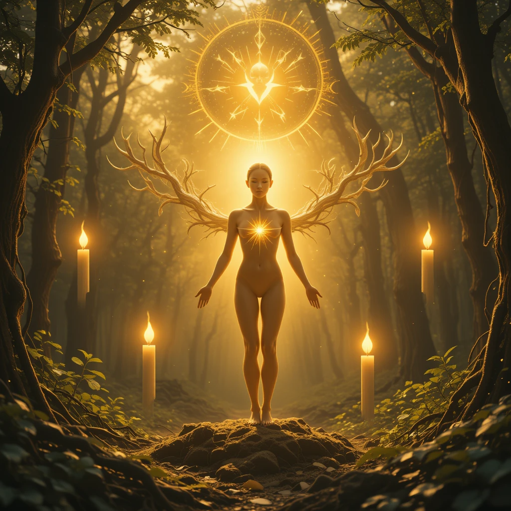 Golden Accord is a luminous, high-resolution artwork created by Æther天神. This piece reveals a golden forest grove where divine order takes form. At the center stands a harmonious figure—radiant, undefined yet deeply human—surrounded by the symbols of transformation: a five-flame star, woven vines, antler-shaped shadows, and the distant flame of Brigid.