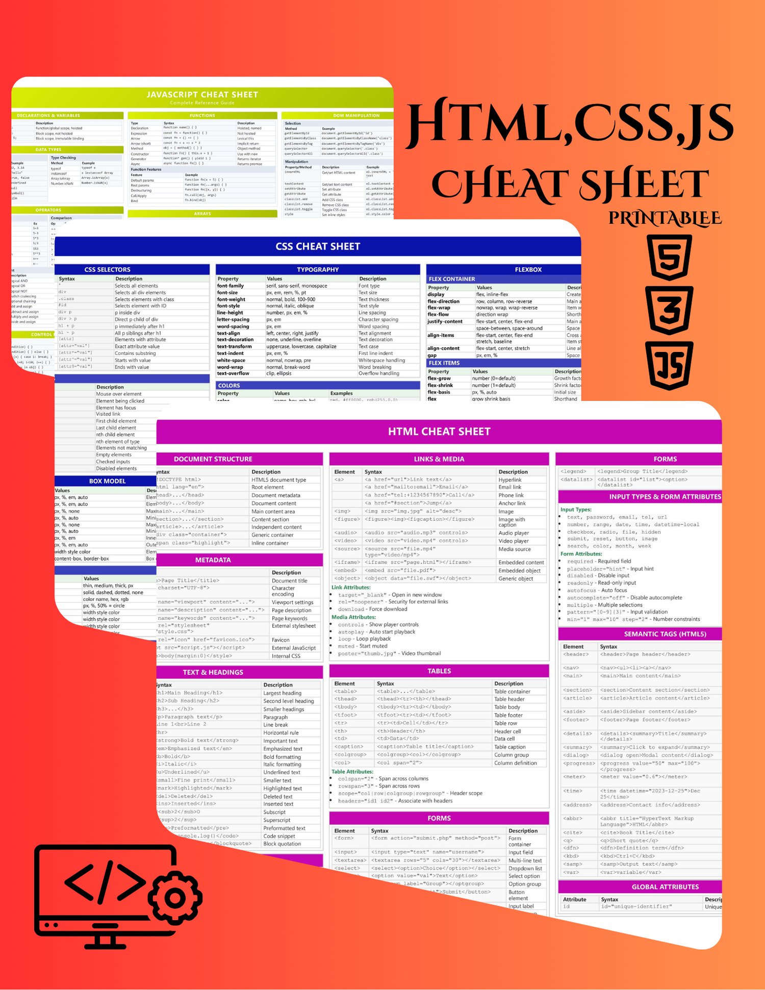 HTML, CSS & JS Cheat Sheet Printable – Compact Quick Reference for Web Development