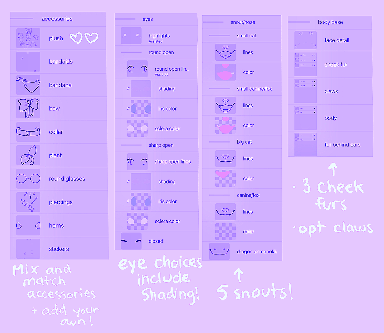 you will recieve the psd file for this base! includes a huge variety of options and customizations (swipe on the image to see). it's the perfect template to make a ref for any of your characters!