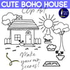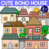 Contains: 2 bushes, fence, flower pot, lawn, walkway pavement, plant, 2 trees, sun, welcome mat, steps, 7 different designed houses.