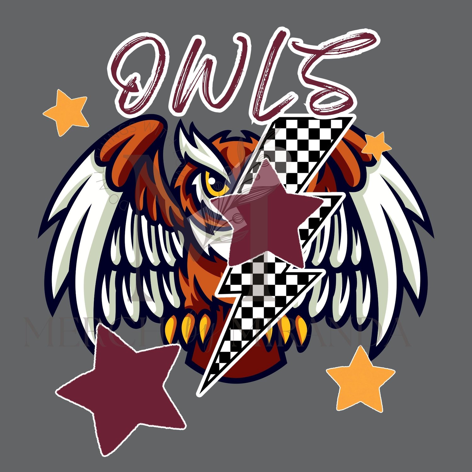 Owl Mascot Maroon and Gold | Sublimation Design | Digital Download | School Spirit Shirt PNG | DTF Design | Lightning Bolt-Checkered with Stars - Owls