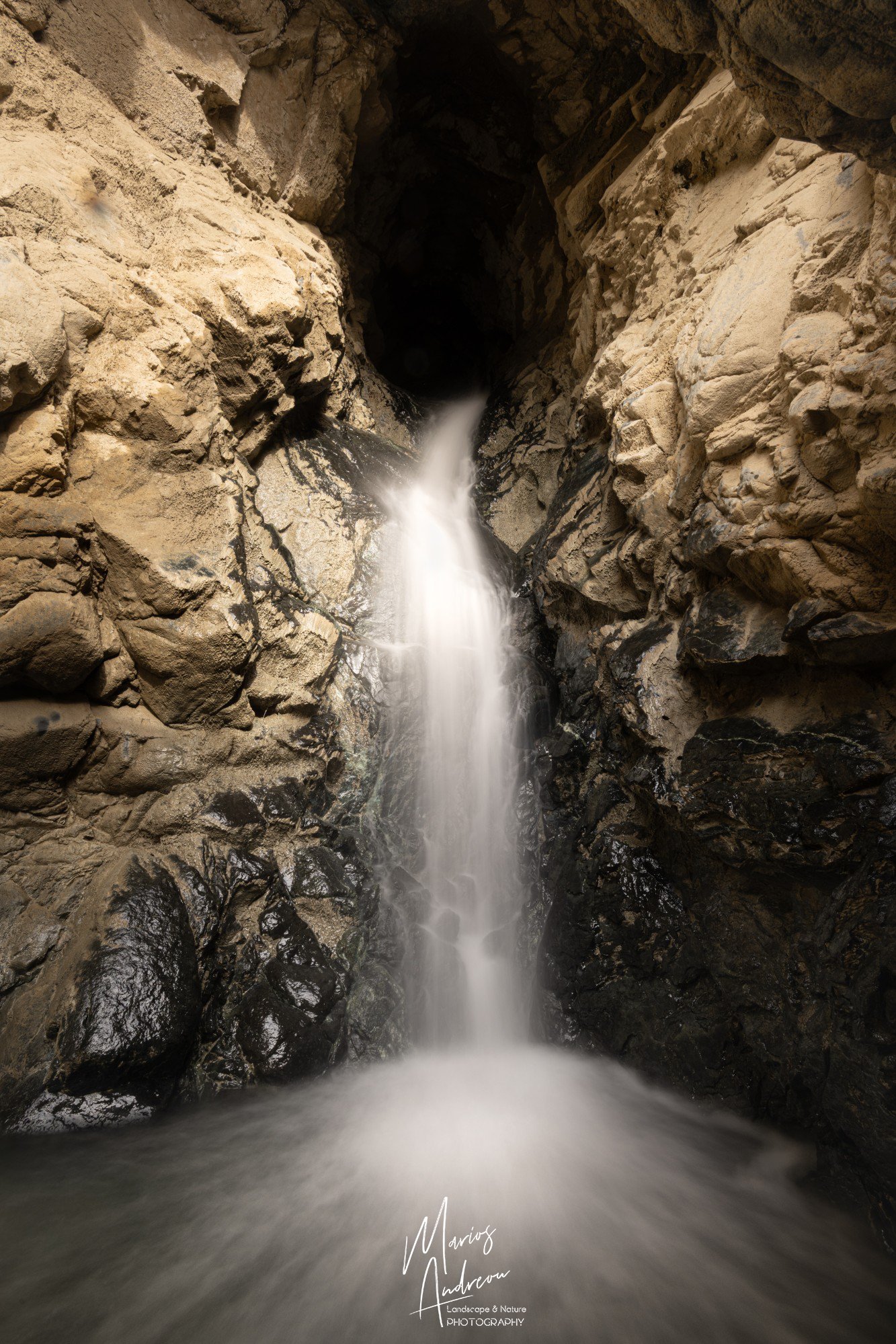 A masterclass in shadow and motion, The Hole captures a raw, subterranean moment within the heart of Amiantos, Cyprus. This long-exposure photograph centers on a narrow, ethereal waterfall cascading from a pitch-black cavernous opening, creating a striking contrast between the unseen depths and the vibrant energy of flowing water.
