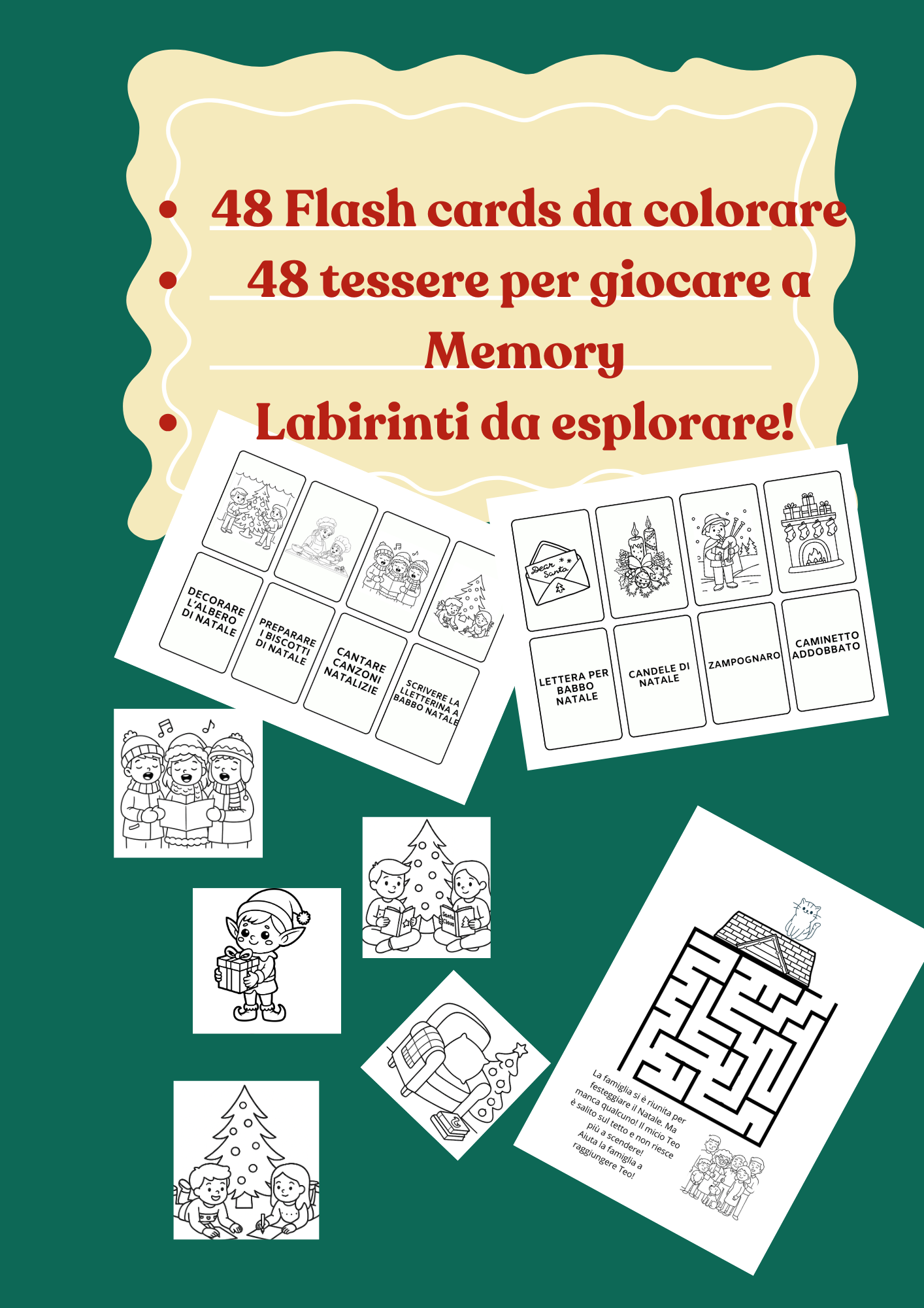 - 48 Flash Cards di Natale da colorare, con immagini di abbigliamento tipico, dolci, tradizioni e decorazioni. Le carte illustrano le cose importanti da fare a Natale: decorare l’albero, fare i biscotti, leggere libri di Natale, cantare canzoni, riposare, giocare con gli amici, stare con la famiglia e scrivere la letterina a Babbo Natale.