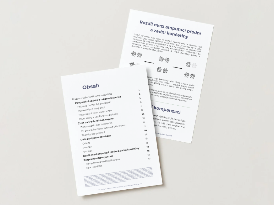 Život na třech nohách je praktická eKniha je určena majitelům psů, kteří čelí životu po amputaci končetiny svého mazlíčka. Život na třech nohách vás krok za krokem provede pooperačním obdobím – od přípravy domova na návrat psa z kliniky, přes zvládání bolesti, až po budování síly pomocí bezpečných a efektivních cvičení.