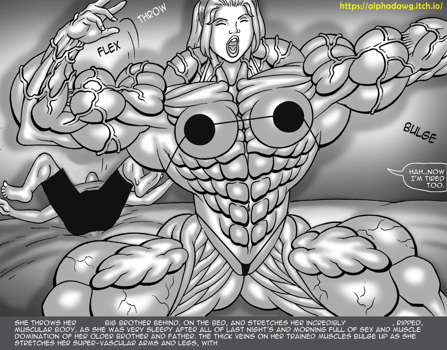Finally, after intimidating her BIG BROTHER with her PUMPED up Muscles enough, she decides to take a FINAL Photoshoot, where she FLEXES and PUMPS her Big HARD MUSCLES, BICEPS and PECS, while COMPARING them with her Big Brother and Father's thin Weak Male Bodies.