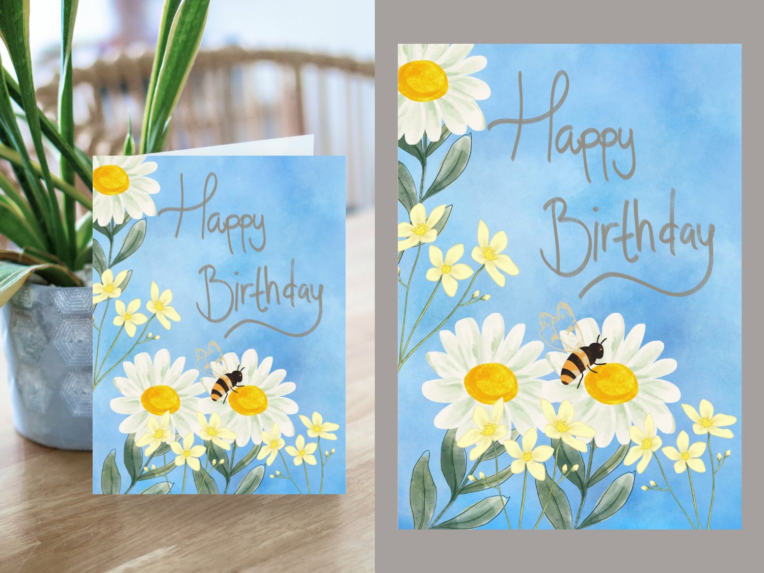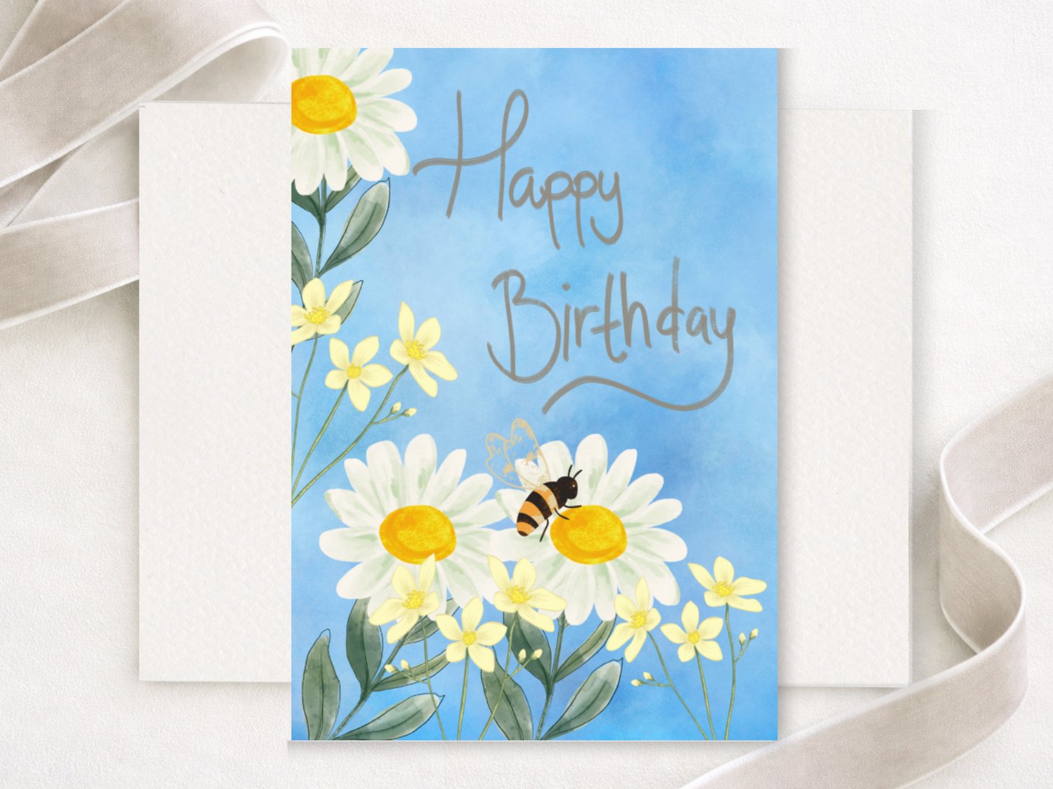Say happy birthday with a soft and sweet card featuring delicate daisies and one happy little bee. With a gentle light background and warm pastel tones, this printable birthday card is perfect for anyone who loves nature, flowers, or simple charm.