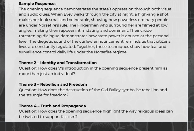 V for Vendetta: A Companion to the Film is a study guide designed for senior English students and teachers. It offers a comprehensive exploration of the 2005 film, combining historical and political context with clear analysis of cinematic techniques, key themes and character development. The guide includes scene-by-scene viewing tasks, sample analytical paragraphs, essay planning models and practice prompts to help students develop critical and creative responses. Whether used for classroom study or independent learning, it provides the structure and insight needed to approach V for Vendetta with depth, clarity and confidence.