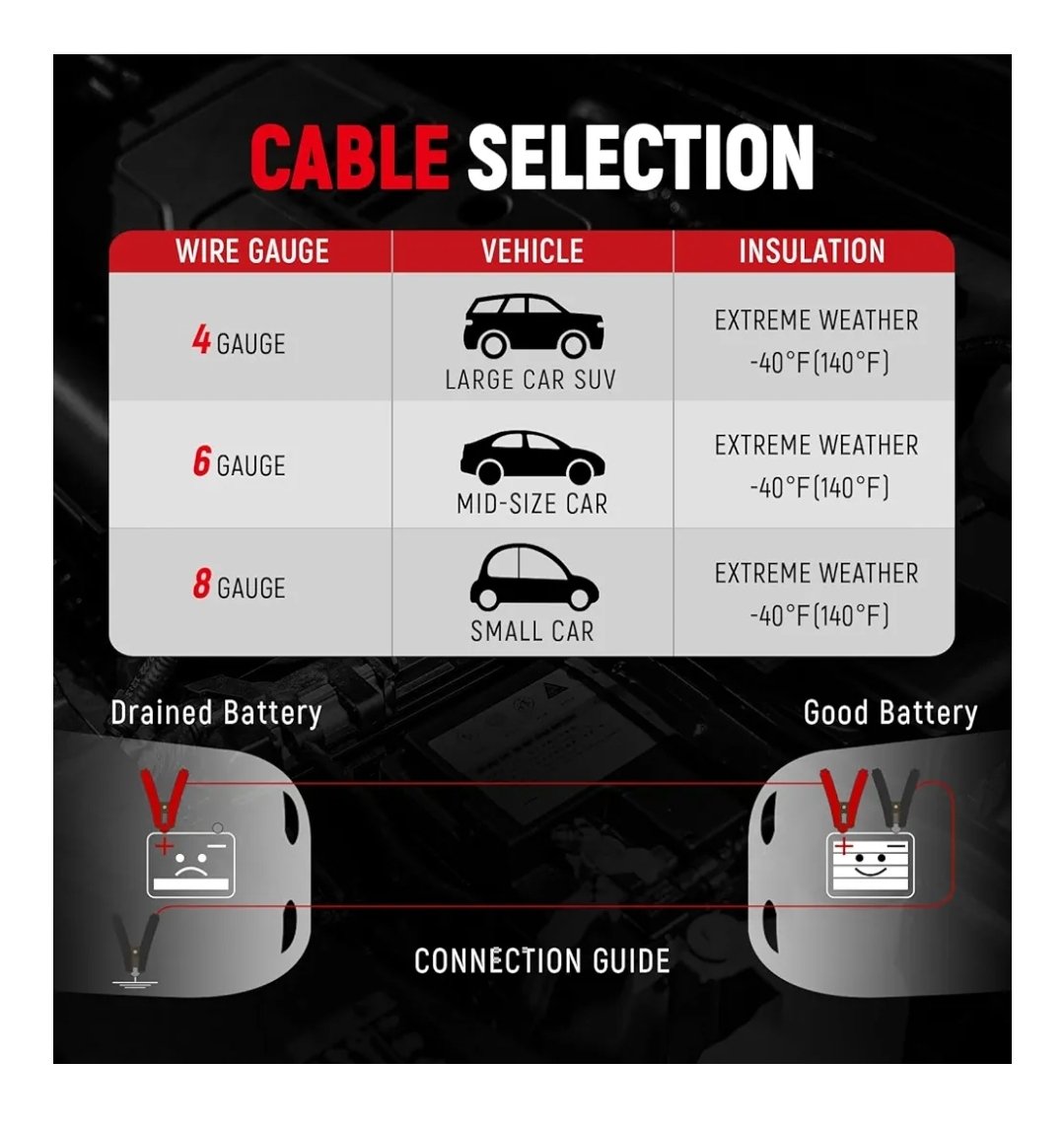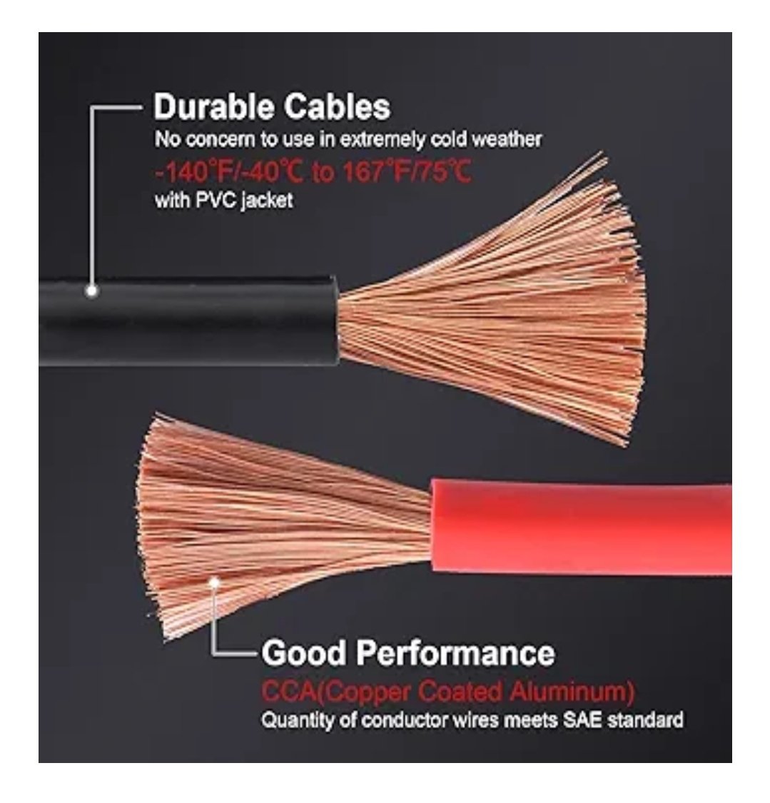20 Feet Jumper Cables: The TOPDC 20 Feet Jumper Cables has an extremely long usage distance, which is suitable for use with SUVs, full-size cars, mid-size cars, and compact cars. The Jumper Cables adopts insulating material to prevent rust, corrosion so effective insulation. The 20 Feet Jumper Cables are suitable for various car models and are powerful helper in emergency situations. Made from high-quality Copper Clad Aluminum (CCA), the thick-gauge cables offer excellent conductivity and maintain flexibility even in extreme cold, providing reliable performance when you need it most.