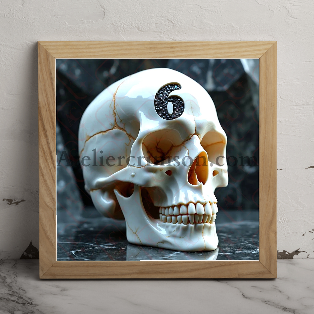 Number 6 skull obsidian marble deeply engraved character on the forehead of a white marble skull. The character, filled with dark obsidian, contrasts sharply against the pale skull. Set against a black crystalline background, the skull and character dominate the image.