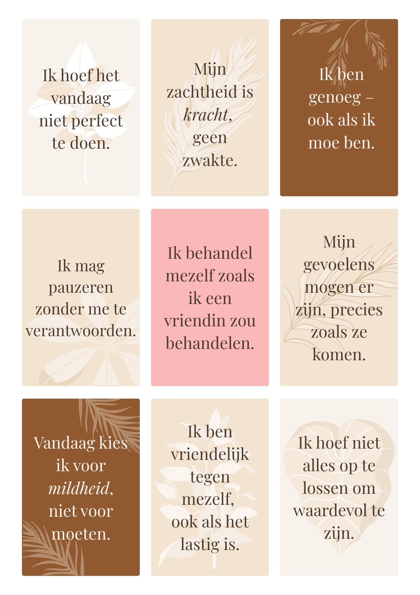 Gebruik ze als dagstart, journalingprompt, rustmoment of zachte reminder in je agenda of op je spiegel.