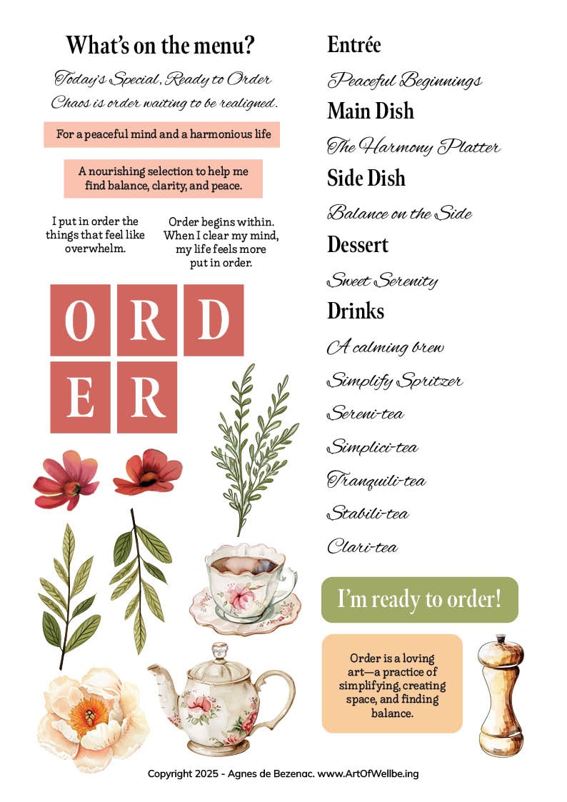 Use these playful pages to create your own calming menu, designed to bring more harmony and order into your life. Choose the words, phrases, and images that you’d like to fill your journal page/life with.