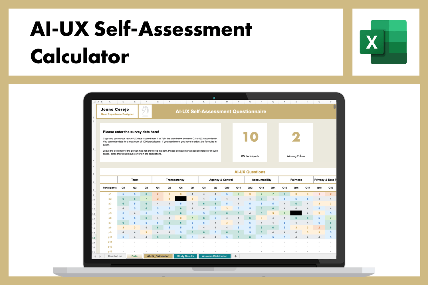 This Excel file serves as a calculator for the AI-UX self-assessment questionnaire. Designed to eliminate the need for manual math and data processing, it allows you to focus on what matters most: the user needs. You just input the data collected from your respondents into the Data Worksheet. The tool then automatically performs all the necessary calculations to interpret the results. It also generates several graphs that can be useful for your presentations. You can easily copy these graphs into your word processor or presentation software.
