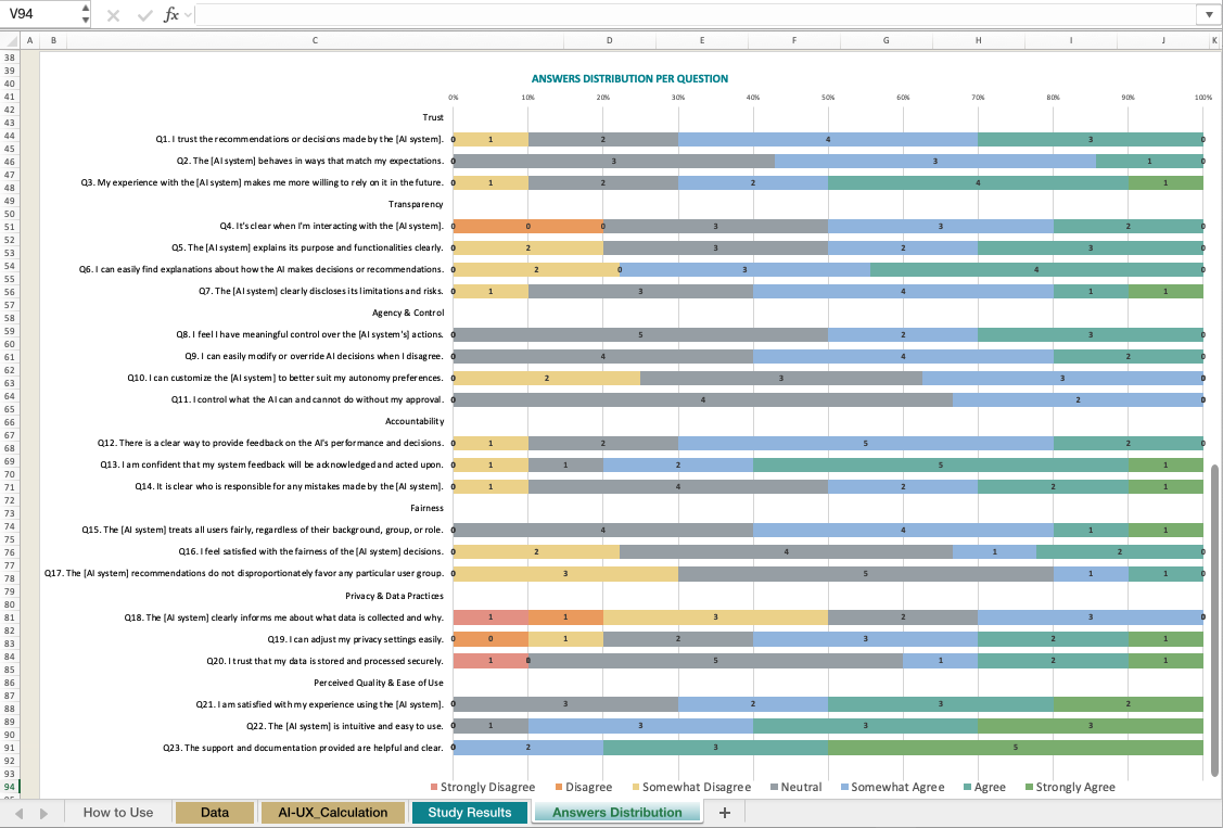 - Study Results: Welcome to the magic dashboard! This amazing tool has been prepared for you to see your AI-UX score, its corresponding grade, and what it means for your AI product or system. The dashboard also displays the distribution of your scores, allowing you to evaluate each dimension's performance and make informed decisions based on the results.