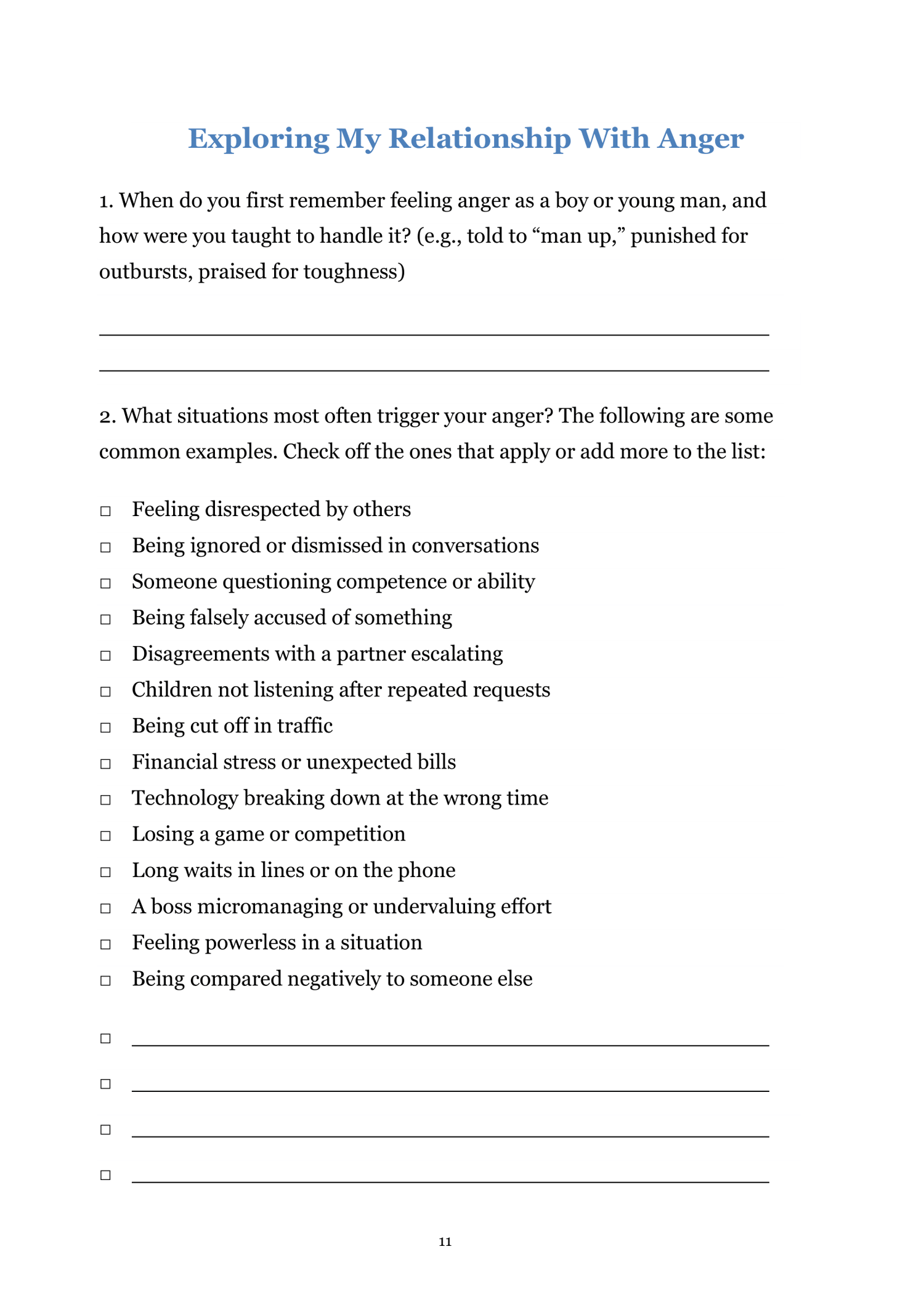 - Provide clear, structured prompts to reflect on stress and anger
