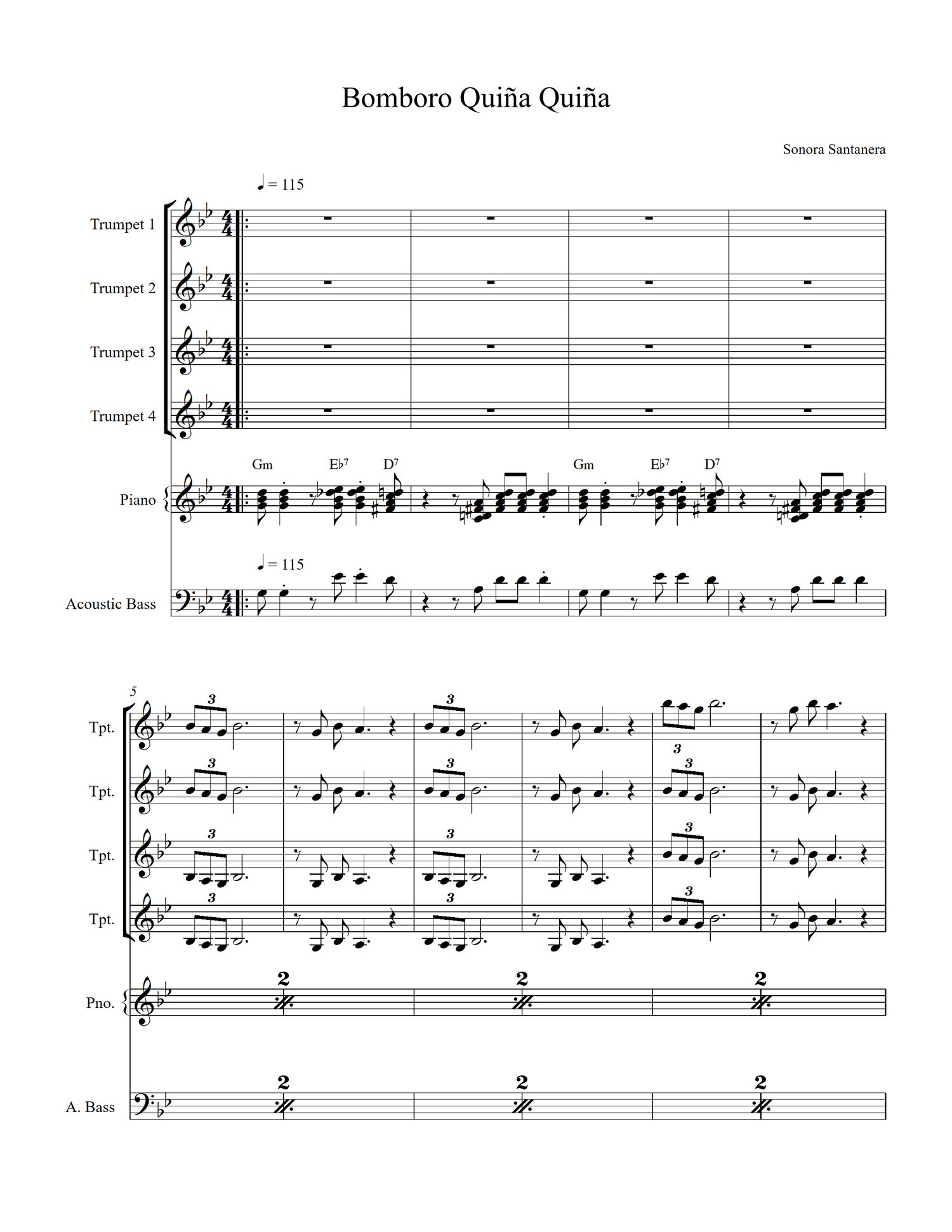 Partitura de la canción (Bomboro Quiña Quiña - Sonora Santanera) Para Trompeta 1,2, 3 y 4, Piano, bajo (Acústico)