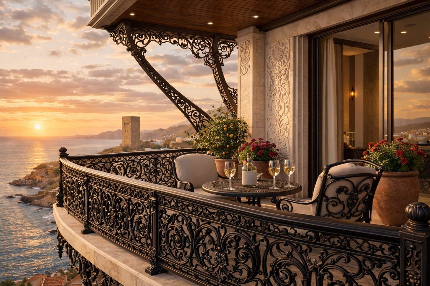A luxurious, classically inspired coastal balcony overlooking the sea at sunset.