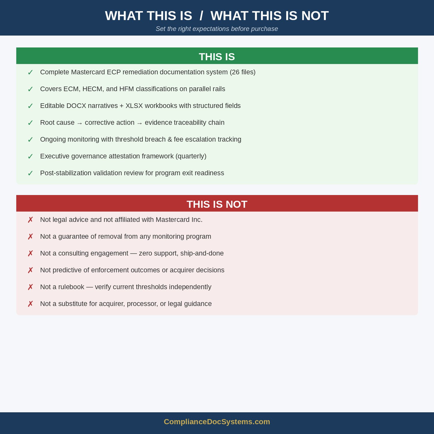 Tactical remediation framework for merchants inside Mastercard’s Excessive Chargeback Program (ECM / HECM) and related fraud-monitoring tiers. Designed to reduce time-in-tier, control fee exposure, and align remediation with Mastercard’s parallel-rail enforcement structure.