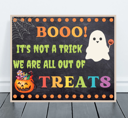 Ran out of candy? Protect your doorbell and get a good night's sleep with this cute sign featuring cartoon ghost and pumpkin artwork and the phrase "It's Not A Trick, We are All Out Of Treats" to let the little monsters know not to knock on your door. Black chalkboard style background with orange, green, and white text and details. Would look fantastic next to the bowl or hung on your front door.