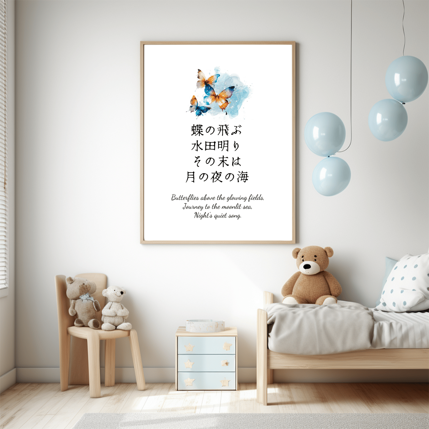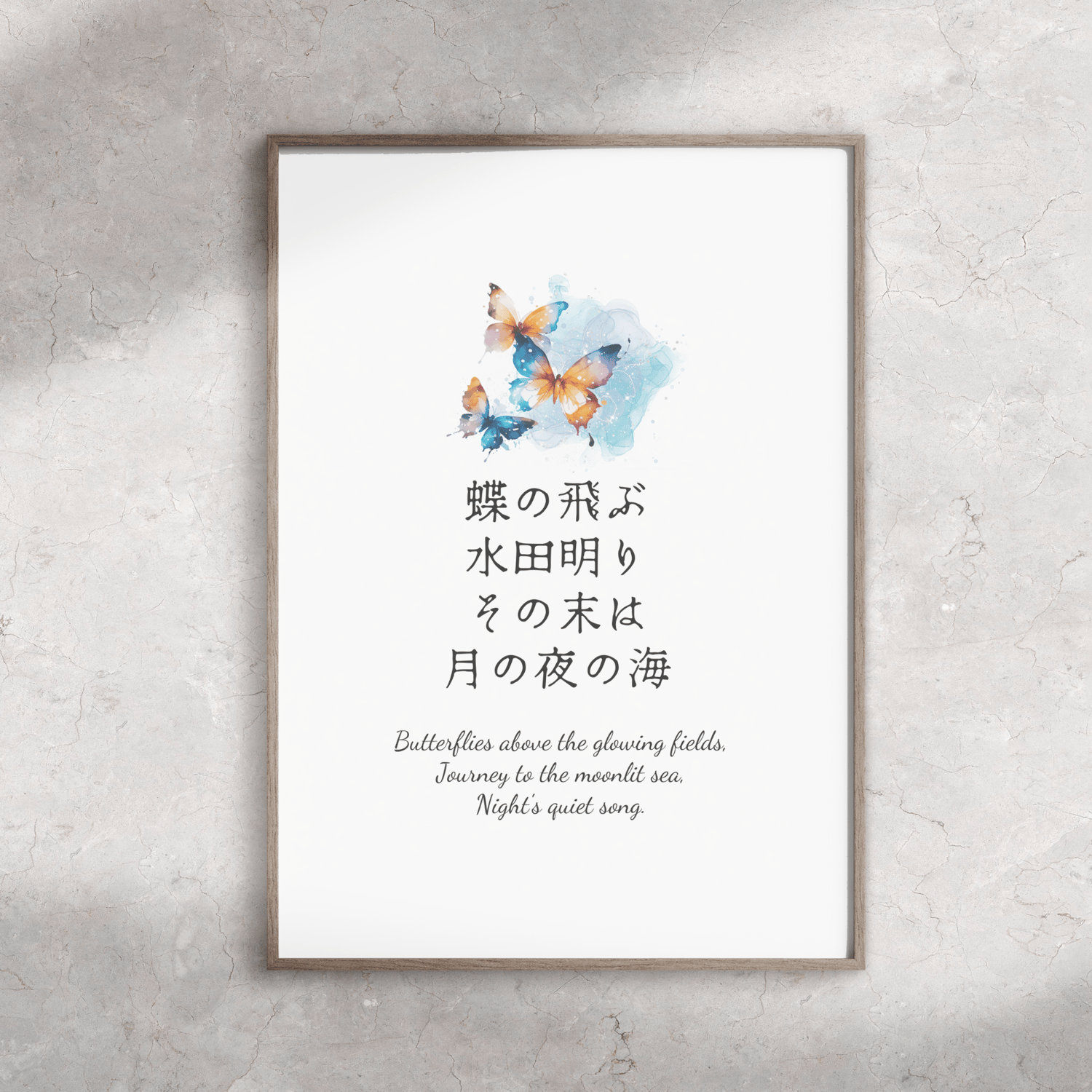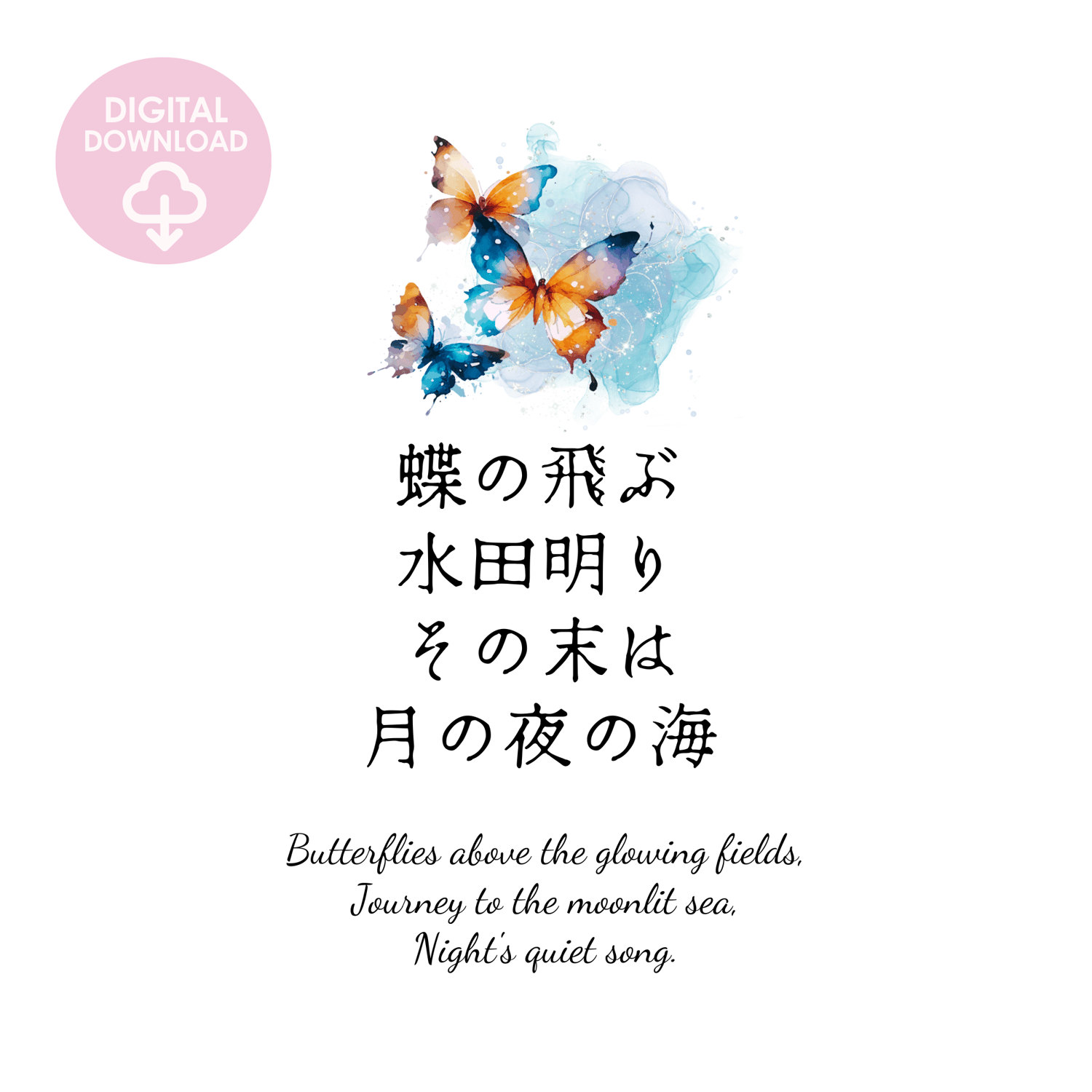 My printable wall art brings the delicate beauty of Kitahara Hakushu's poetry to life. Featuring a dreamy butterfly in watercolor, it blends Japanese and English verses that capture the magic of a moonlit dance over water.