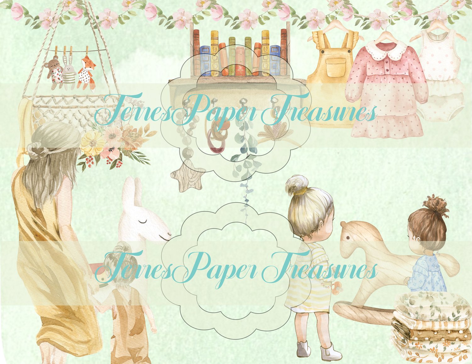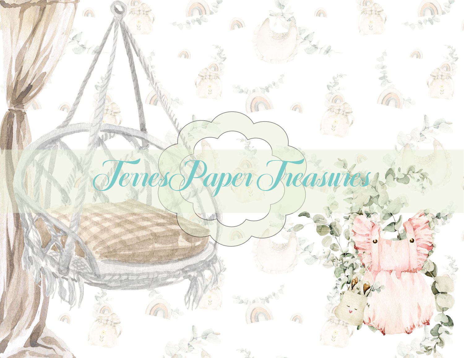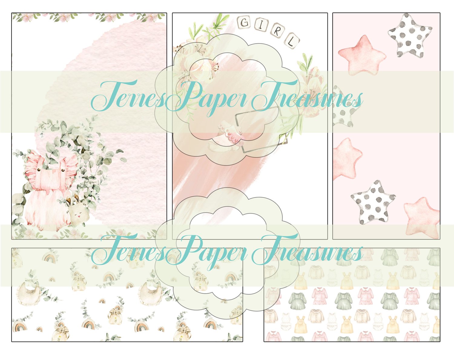 Sweet Boho Baby Girl kit for new babies scrapbooking or junkjournaling. These precious papers are so adorable. 15 papers total and one Freebie which make 16 total papers. 11 full papers for the kit, 2 sweet background papers, 2 helpful ephemera papers. (1 Collage freebie included, please send email to receive the freebie.) I have added a couple of papers in the "extra" zipped folder.
