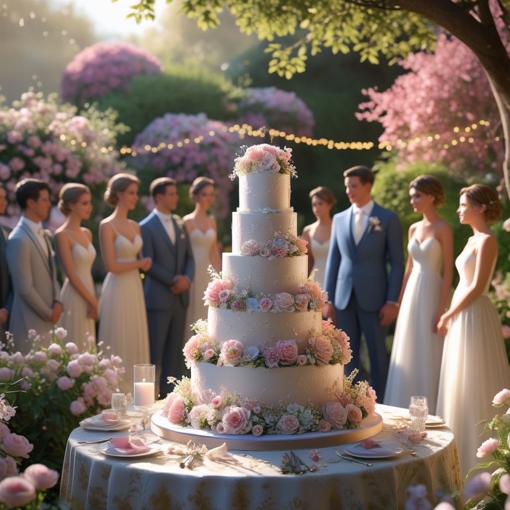“A beautiful outdoor wedding scene set in a lush garden filled with blooming flowers and soft sunlight. A stunning multi-tiered wedding cake sits elegantly on a decorated table, adorned with delicate floral arrangements and intricate icing details. The bride and groom stand nearby, surrounded by elegantly dressed guests, twinkling fairy lights, and soft pastel decorations. The scene captures a romantic, joyful atmosphere with ultra-realistic details, warm lighting, and a dreamy, cinematic quality.”