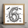 Number 6 coloring book halloween occupying 90% of a 1024x1024 image. Use an Old English font style with clear outlines resembling a coloring book page. The character is composed of intricate bat silhouettes, creating a spooky Halloween atmosphere. Use only pure black (#000000) for the character and outlines, and white for the background.2D, black and white style resembling a high-quality adult coloring book page.