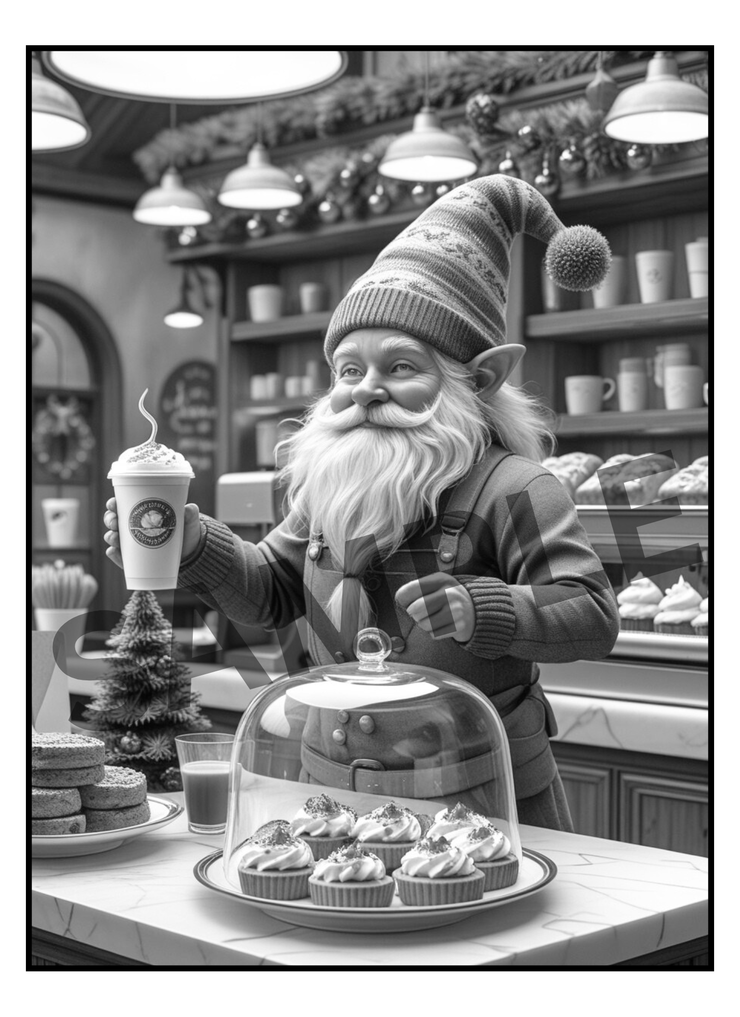 "North Pole Gnomes Greyscale Adult Coloring Book" is full of busy Gnomes getting ready for the holidays at the North Pole! Join in the fun as they go Sledding with a Polar Bear, Drink Cocoa and Watch the Northern Lights, Hang Decorations and even Serve up the Best Latte in Town!