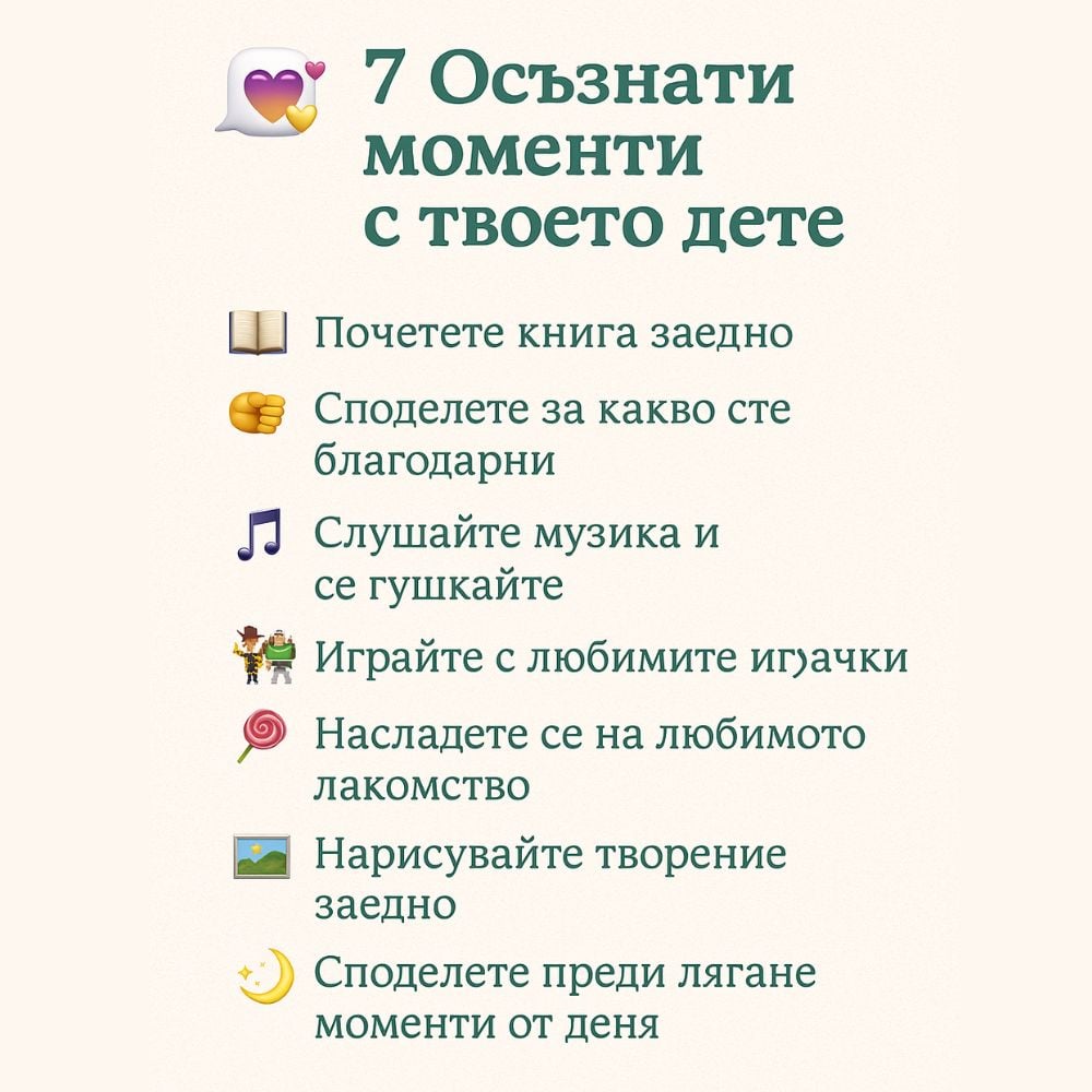 Искаш ли повече свързаност и спокойствие в ежедневието с детето си? Този красив чеклист ти дава 7 лесни идеи за качествено време заедно – от четене и игра до споделяне на емоции и любими моменти. Перфектен за заети родители, които търсят лесен начин да бъдат по-присъстващи и свързани.