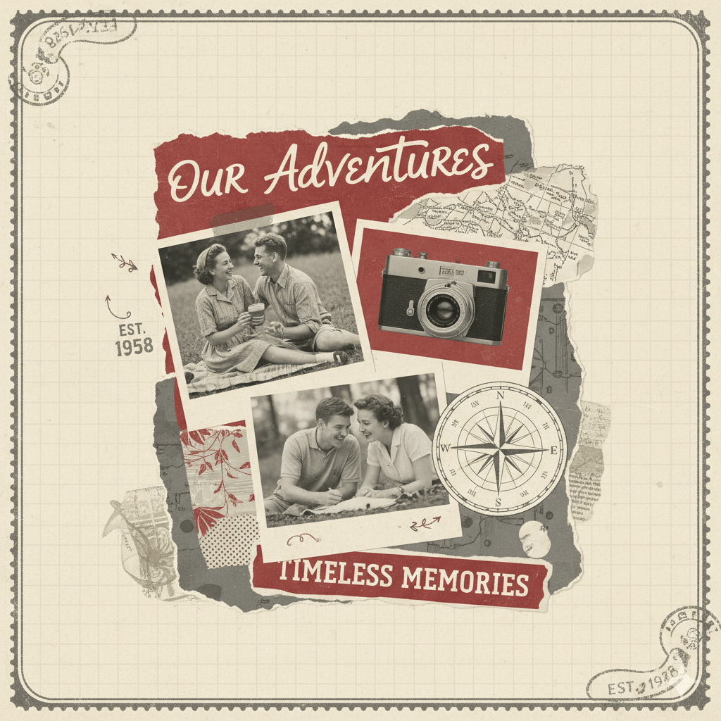 "A vintage-style scrapbook photo collage featuring a classic grey and red color palette. This design blends nostalgic elements with torn paper textures, retro overlays, and handwritten accents to create a warm, personal vibe. Perfect for sharing memories, aesthetic moments, or storytelling posts on Instagram with a timeless and artistic touch."