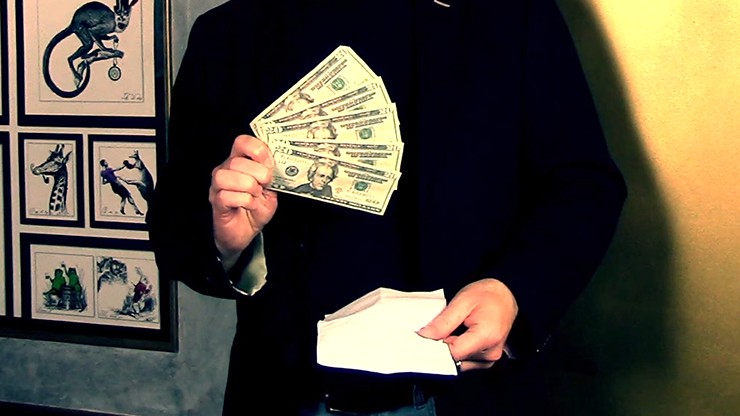 Five pieces of paper are shown to be completely blank on both sides. They are then placed behind the money maker sign and almost immediately the sign is removed to show all five pieces of paper have transformed into money.