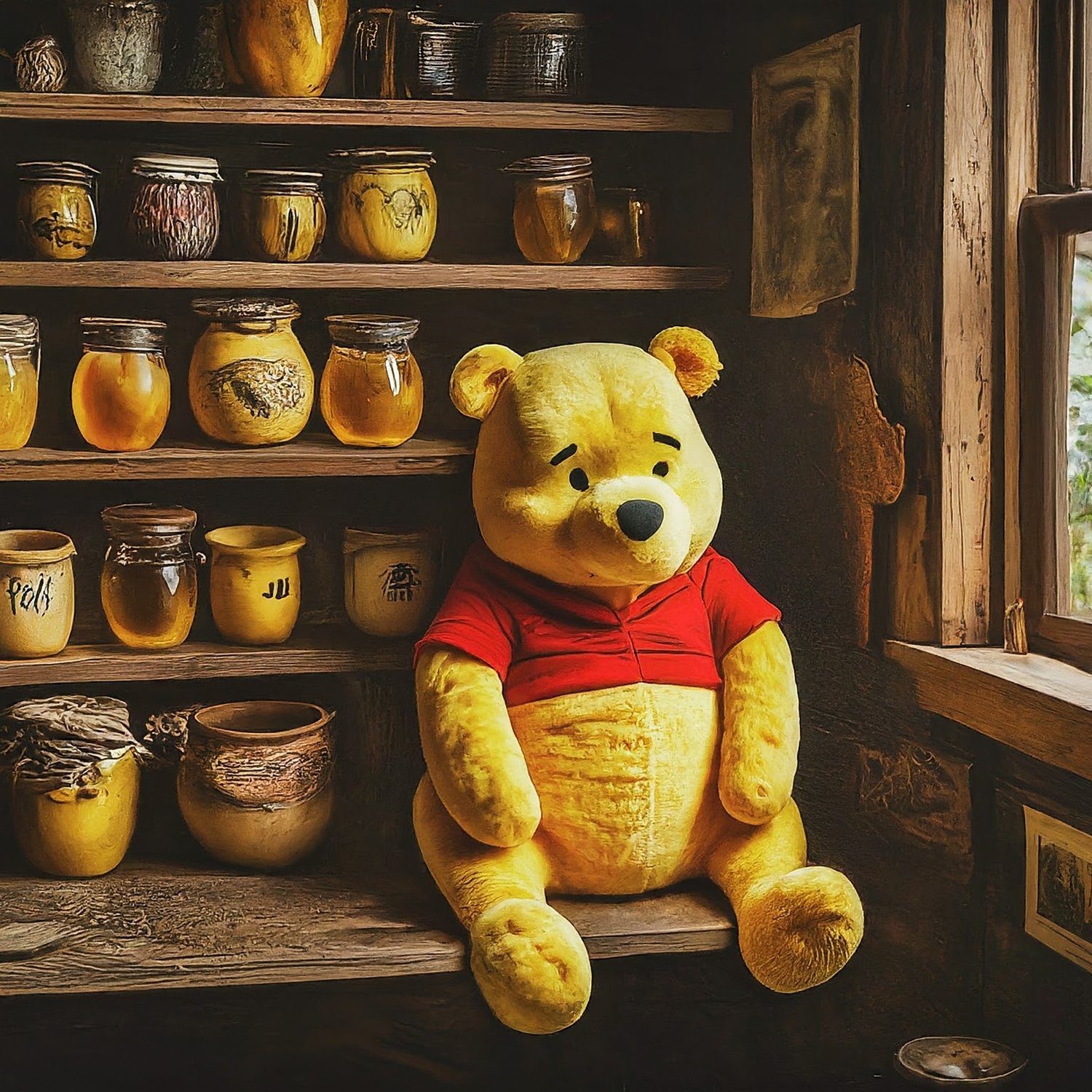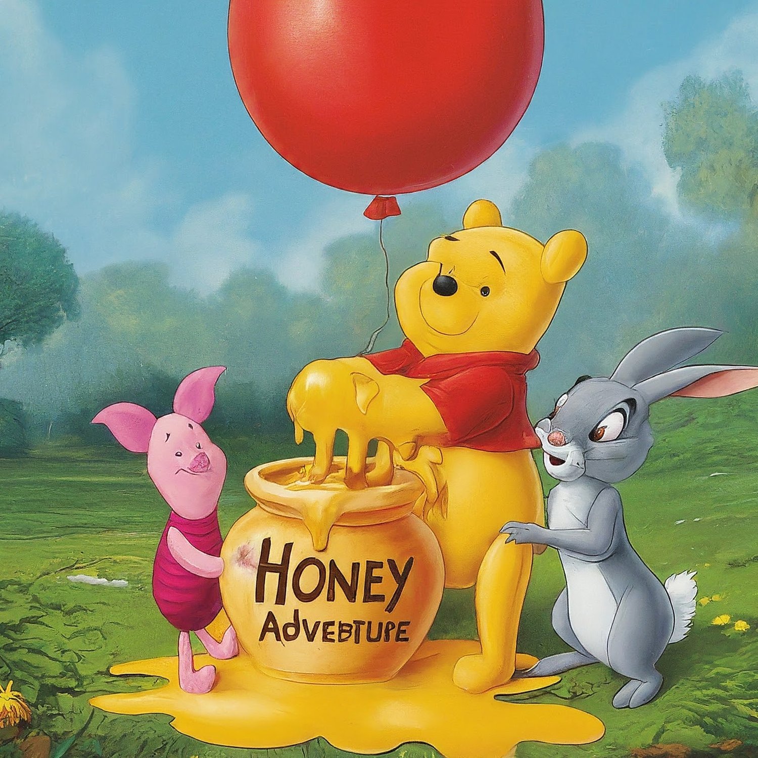 This vibrant digital print, perfect for any nursery or child's room, captures the classic tale of Winnie the Pooh's quest for his favorite treat.