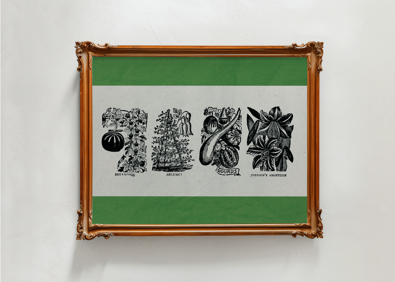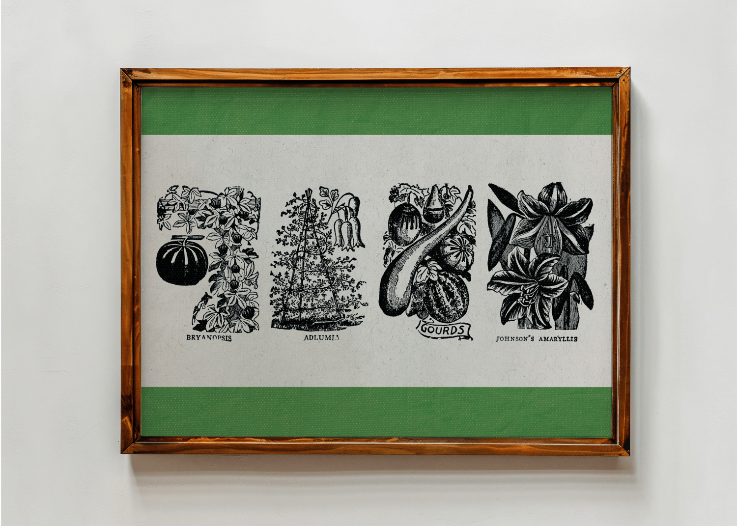 Vintage Plant and Veggie Illustration— A celebration of cultivation and care, Thomas E. Hill's Vintage Plant & Vegetable Illustration is rich in detail and earthy charm. Each specimen—leaf, root, stem, fruit—is drawn with a botanist's precision and an artist's affection. Whether it's a plump radish, curling vine, or leafy sprig, every element is offered as a gift from soil to sight. The composition feels archival, as though capturing a moment in a garden's unfolding, yet there is warmth here, too—a sense of season and sun, of nourishment both physical and visual. It is a piece that honors the quiet miracle of growth and the humble beauty of what feeds us.