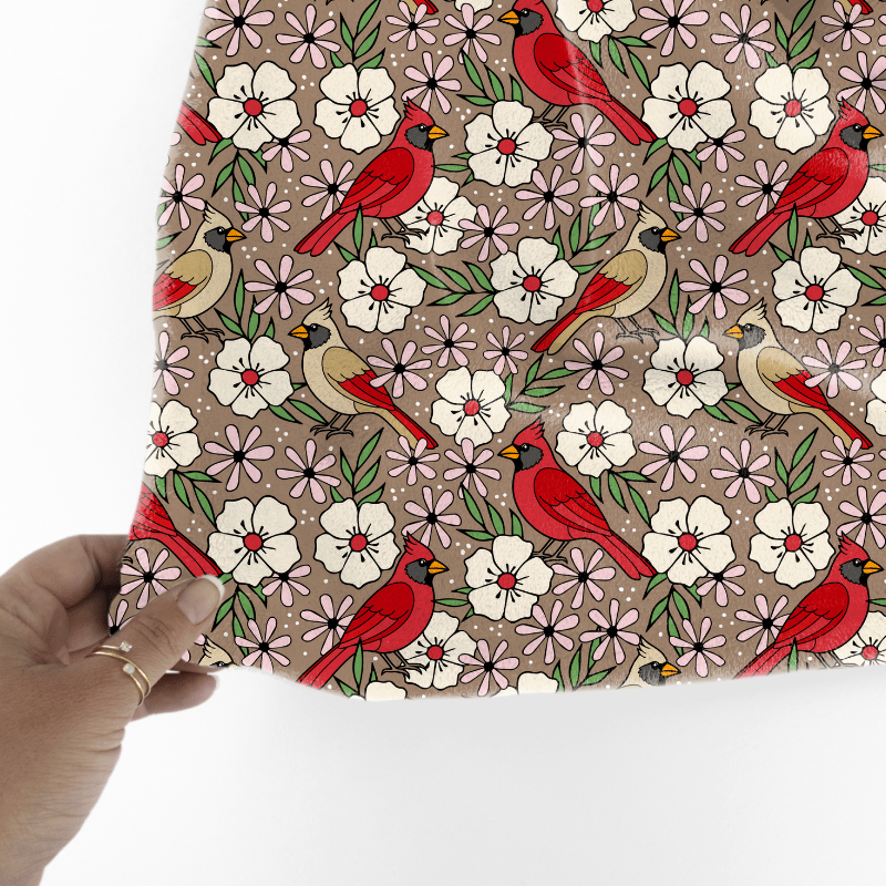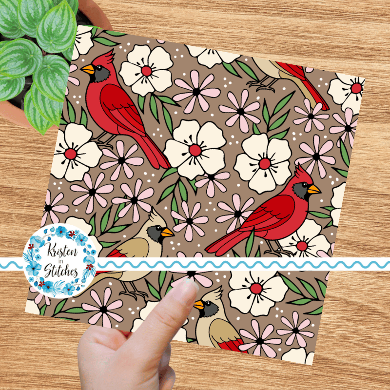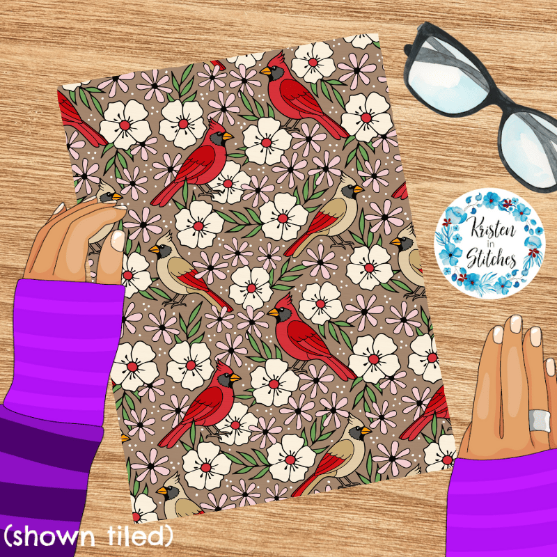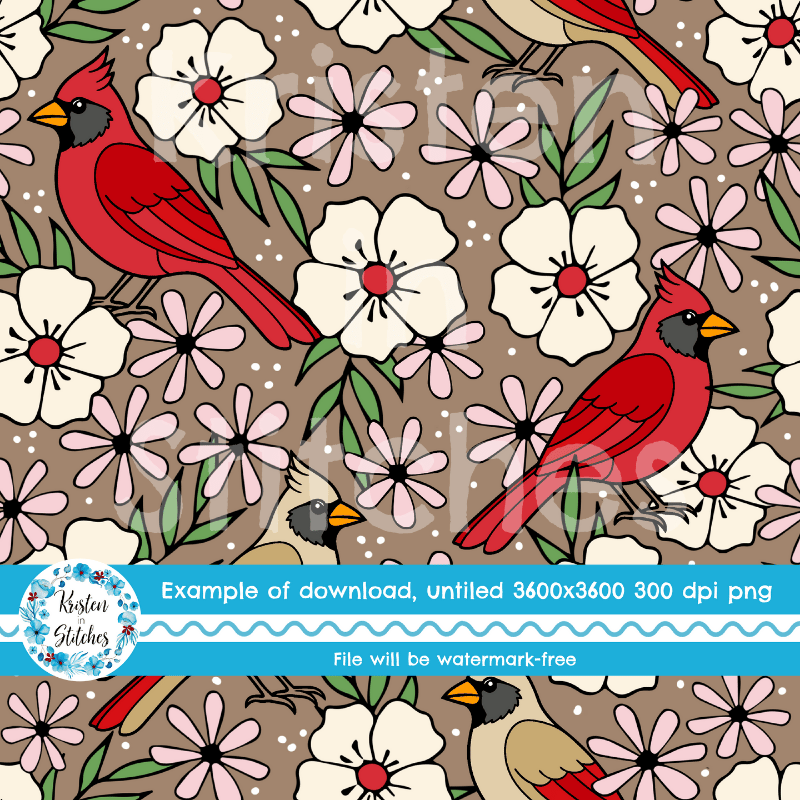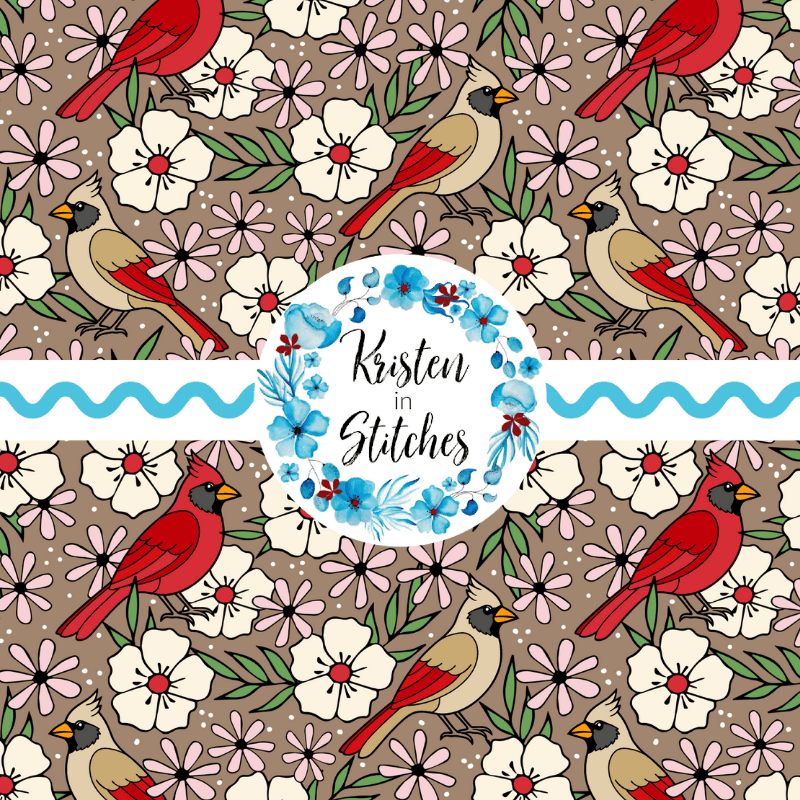 Red Cardinals Male Female Birds and Flowers Seamless Pattern