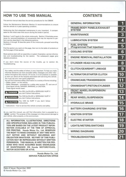 2001 Honda CB900F 919 Service Manual Part 61MC200