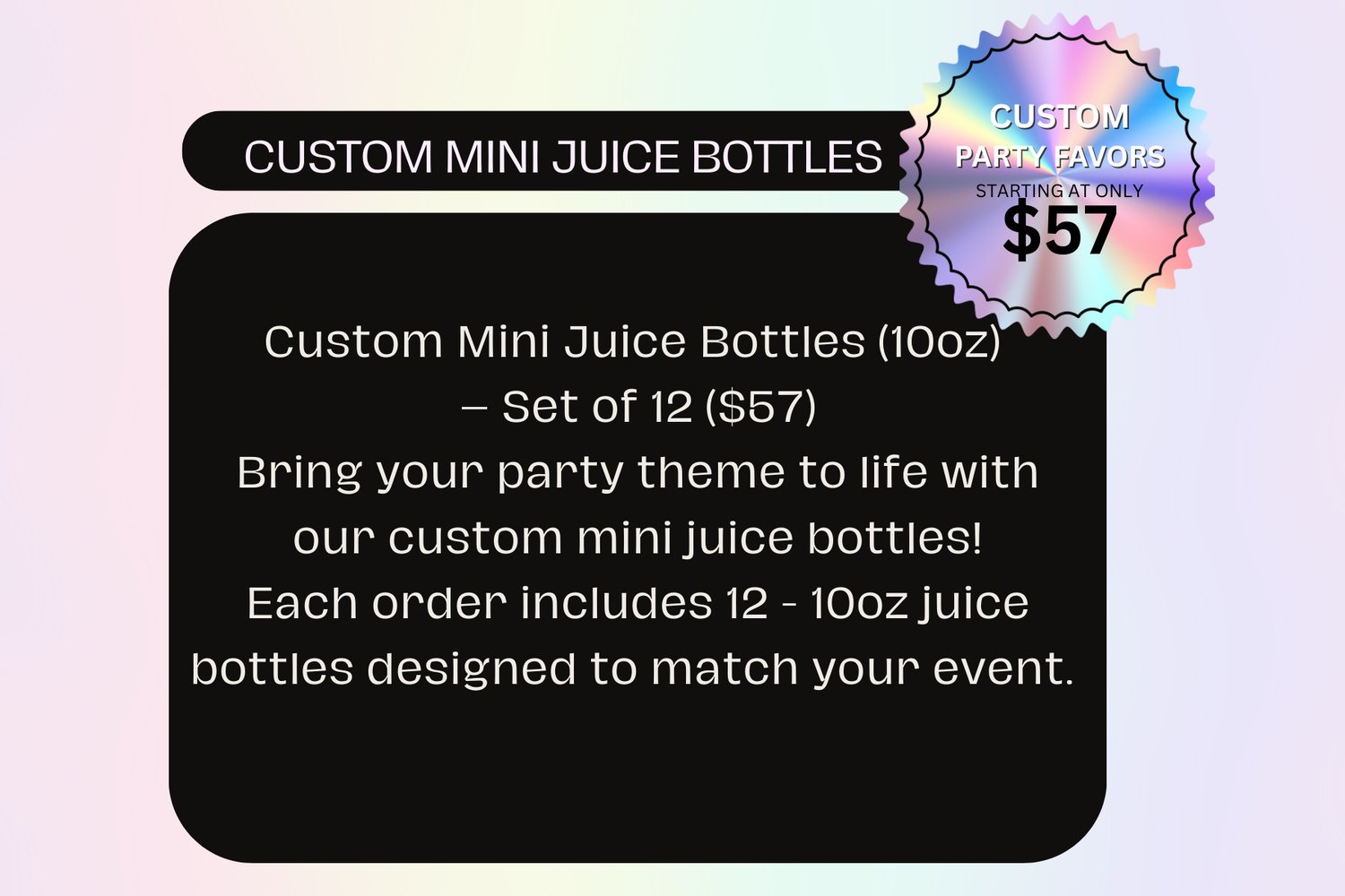 Add the perfect touch of glam to your event with our custom-designed 10oz mini juice bottles (flavor of your choice)! Each order includes 12 personalized mini juice bottles for $57, created to match your theme and make your party unforgettable. See the magic for yourself! Party Favor Magic