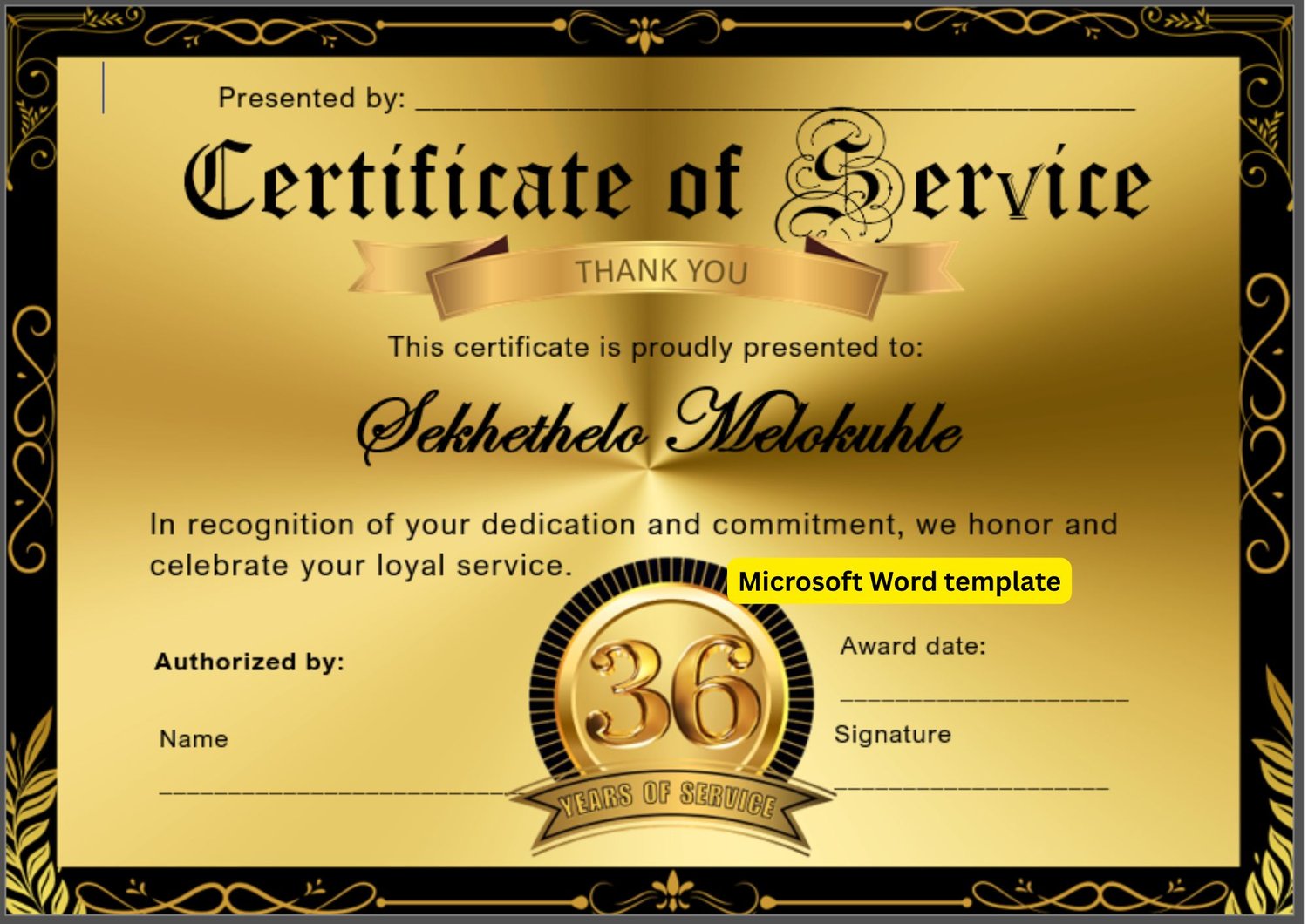 Mark a significant milestone in your employees' journey with our exclusive "36 Years of Service" digital certificate template for MS Word.