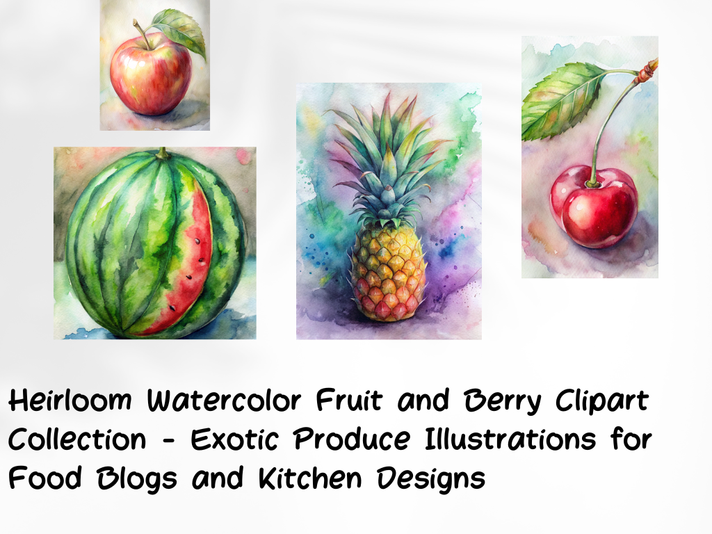 Heirloom Watercolor Fruit and Berry Clipart Collection - Exotic Produce Illustrations for Food Blogs and Kitchen Designs