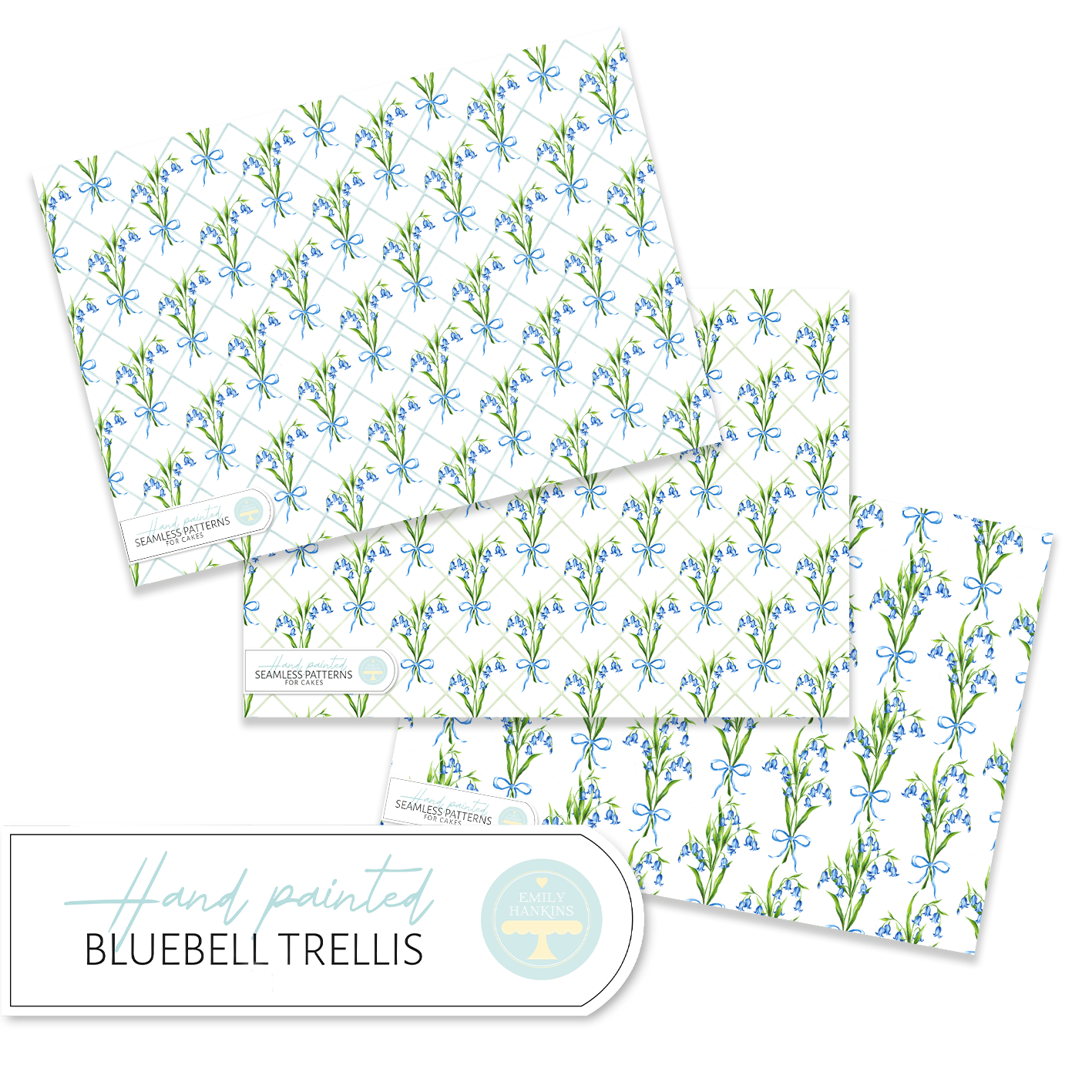 The designs are inspired by the delicate bluebells that adorn my garden in spring. The three different designs feature nodding bluebells, two on trellis backgrounds in two different colourways and one as a trailing pattern. Each flower has been hand painted by Emily and painstakingly crafted into a seamless pattern for your cake designs.